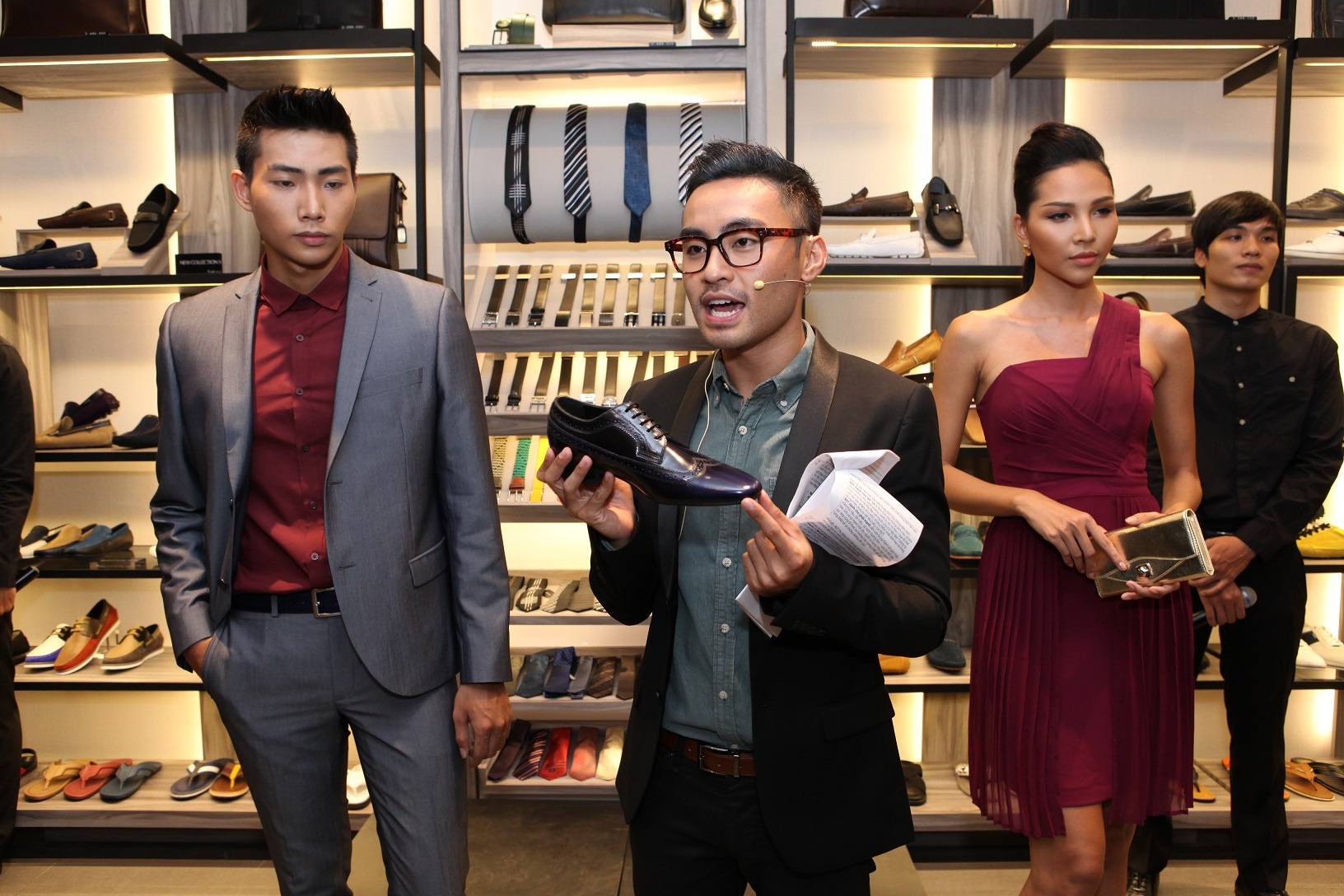 | MC VJ Dustin Nguyễn giới thiệu phần Style Workshop với 3 phong cách: dạ tiệc, công sở, dạo phố. Anh phân tích về những điểm nhấn tinh tế trên từng sản phẩm dành cho nữ giới. |