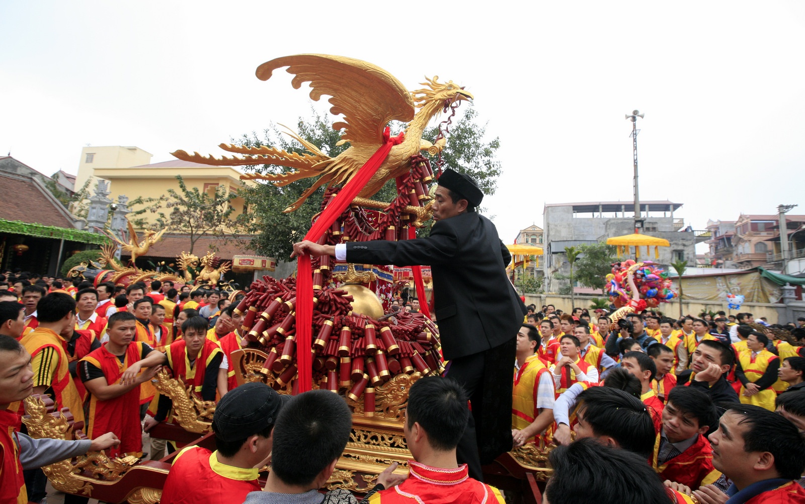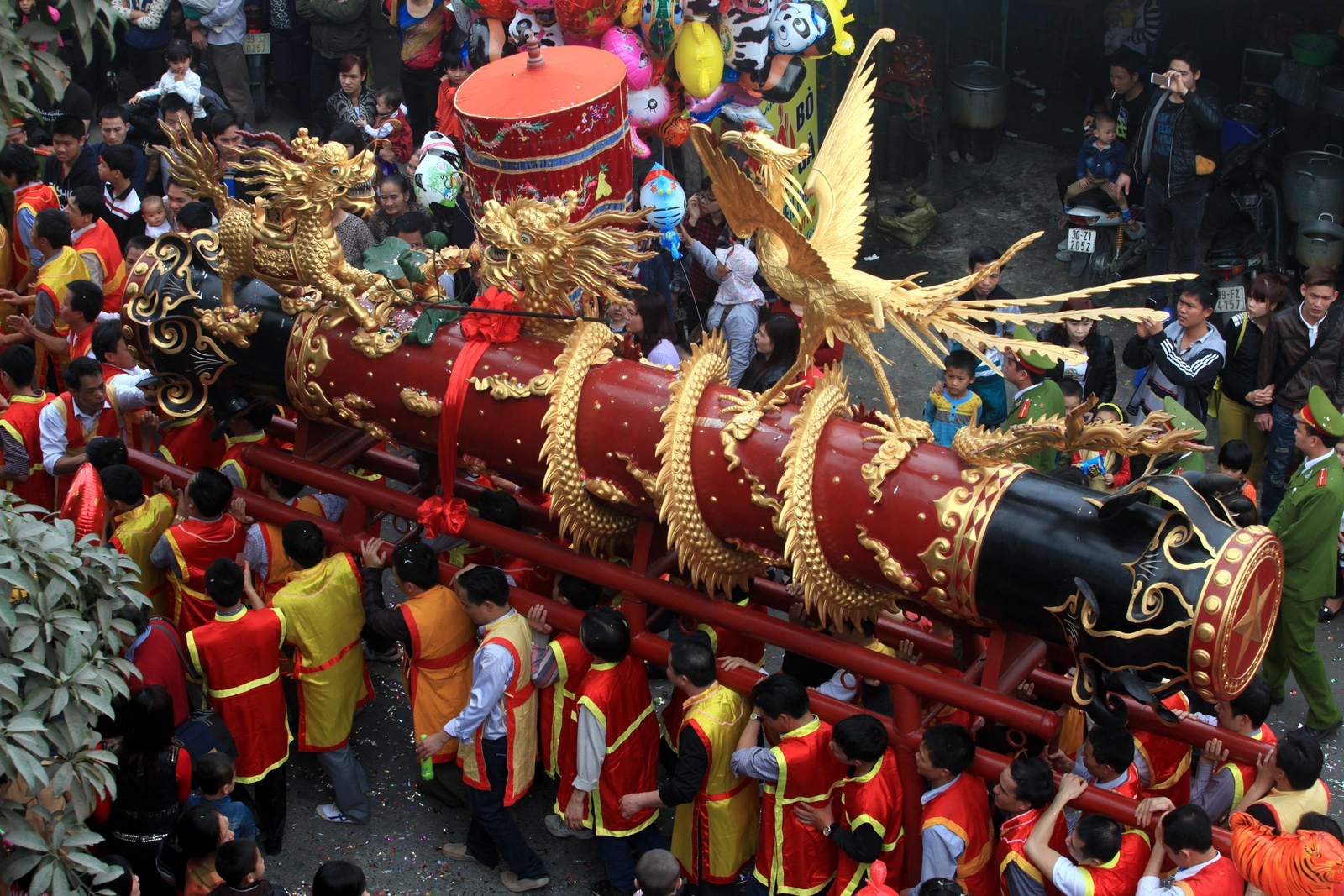Đặc điểm của hội là màn rước quả pháo giả, dài 6 mét, đường kính 60cm, được trang trí các hình tượng rồng, phượng đậu bên trên.
