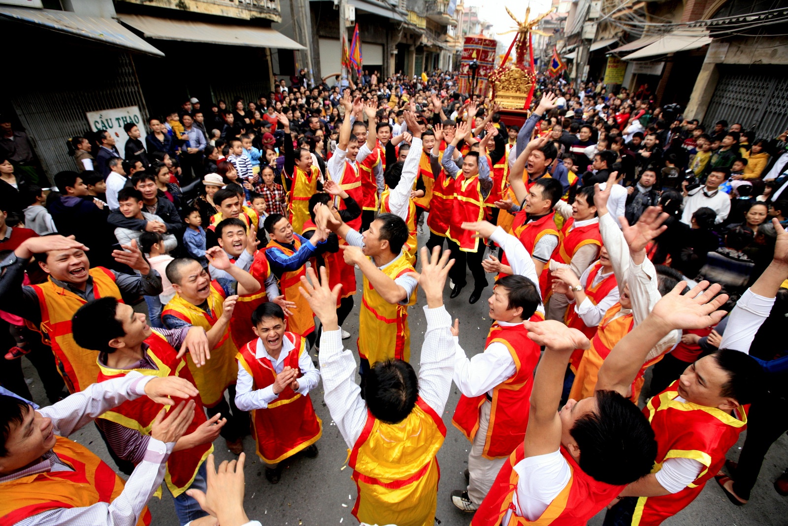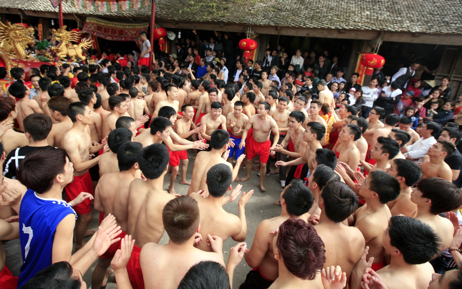 Trong khi các cụ làm lễ, đám thanh niên trai tráng các làng được tập hợp lại để rước tràng và quả về gian đình.