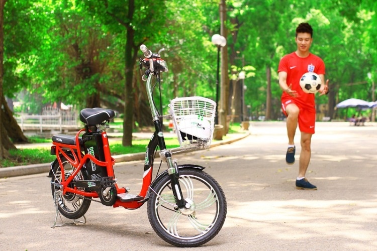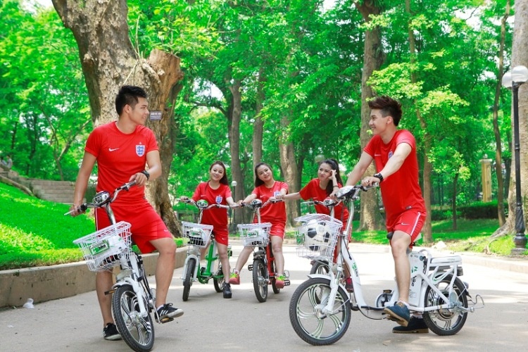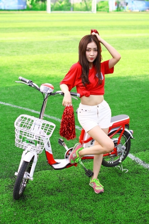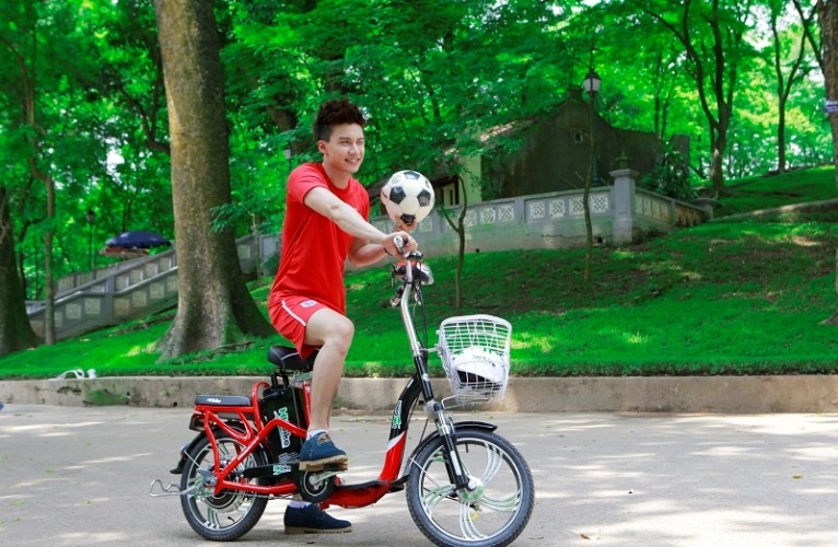 Để thực hiện bộ ảnh cổ vũ tuyển “Tam sư”, nhóm bạn trẻ này còn trưng dụng những chiếc xe đạp điện để khuôn hình sinh động và phong phú hơn. Chiếc xe màu đỏ - đen rất ăn nhập với kịch bản này là dòng xe Zinger Extra của thương hiệu xe đạp điện HKbike. Đây là dòng xe điện duy nhất trên thị trường ứng dụng pin Lithium-ion công nghệ FLiP, cho phép xe đi được quãng đường lên tới 90 km/lần sạc.