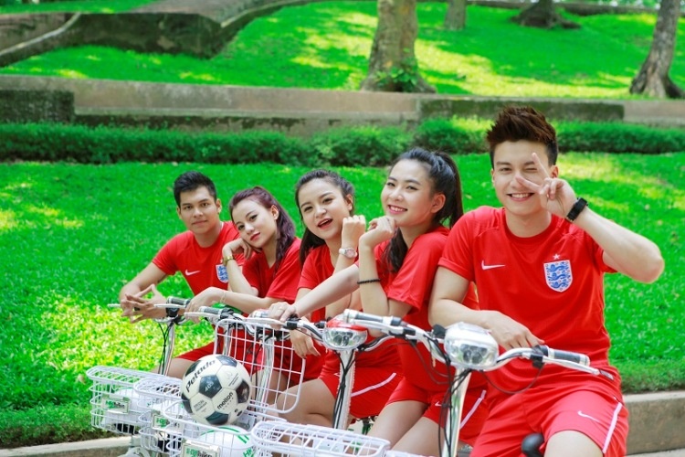 Để cổ vũ cho tuyển “Tam sư”, đội hình nam thanh nữ tú đã có cách riêng để thể hiện tình yêu với đội bóng mà họ yêu thích, với đạo cụ là những trái bóng, bông xù và xe đạp điện.