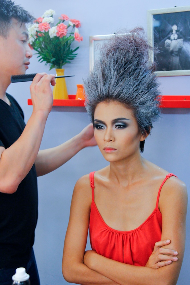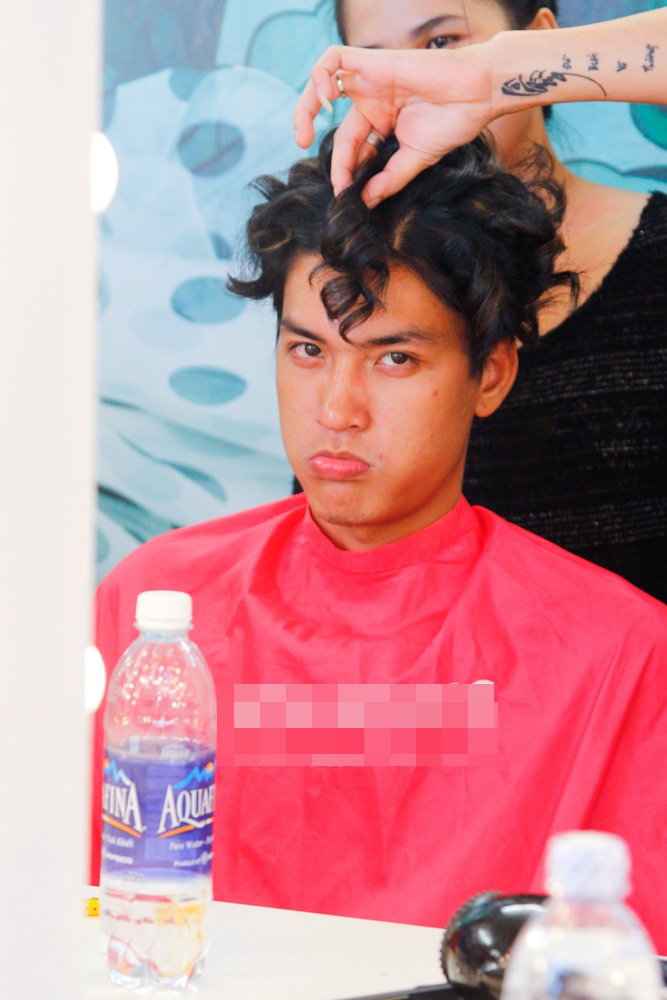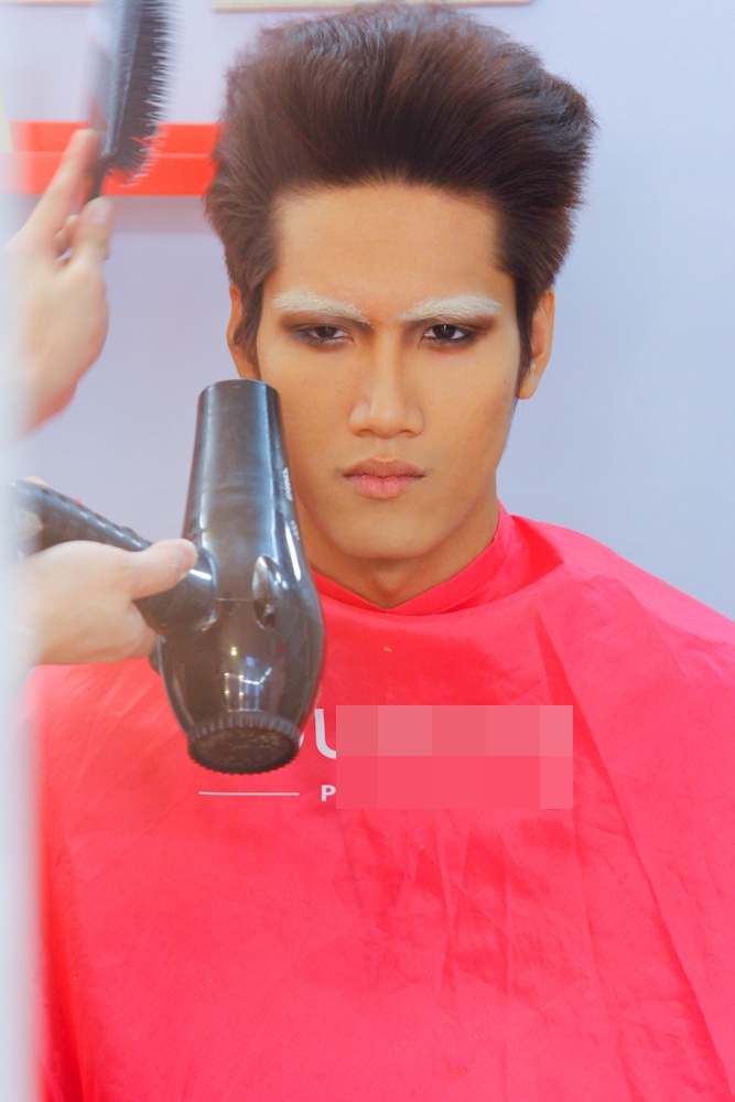 Tuấn Việt được hóa trang gần xong, các chuyên gia tạo kiểu tóc cá tính cho người mẫu.