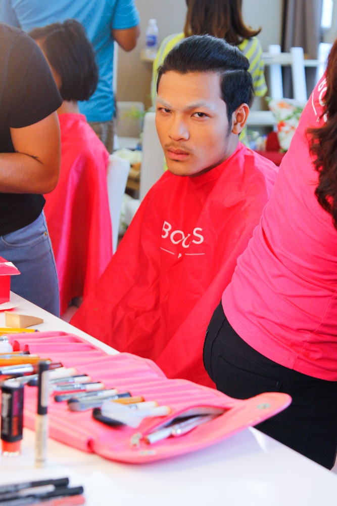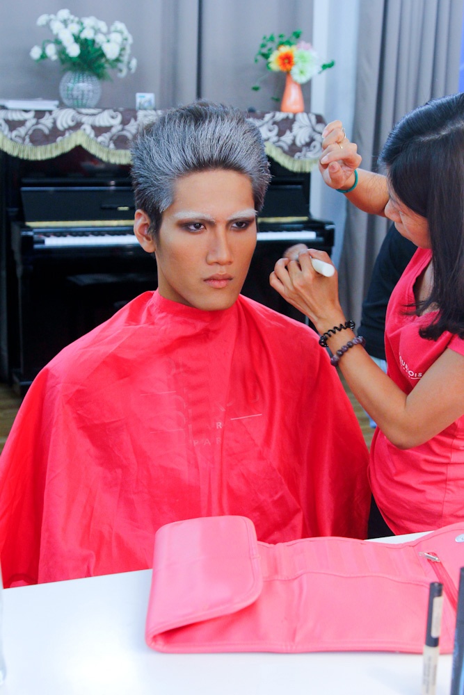 | Tuấn Việt bắt đầu được các chuyên gia tô son điểm phấn để tạo hình mới. |