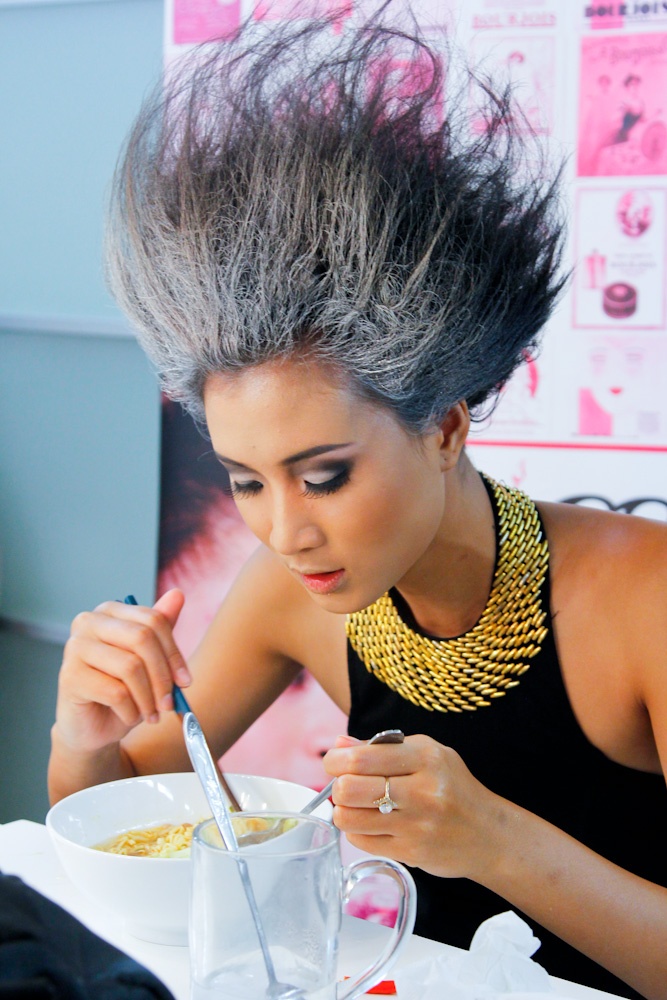 Phần tóc cá tính của Mâu Thanh Thủy được dựng ngược rất ấn tượng.