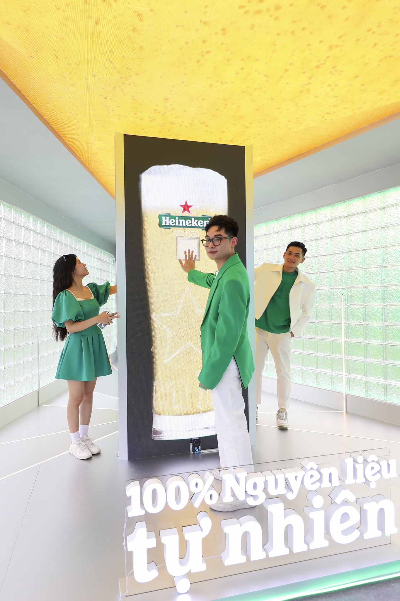 | Heineken khẳng định chất lượng suốt 1,5 thế kỷ tại khu vực “100% nguyên liệu tự nhiên”. Ở đây, khách tham gia được chiêm ngưỡng màn trình diễn công nghệ bùng nổ, tương tác, kích hoạt dòng chảy bia với hương vị không đổi của Heineken suốt 150 năm trong không gian đa chiều. |