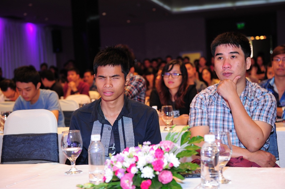 | Hà Văn Đông (trái) thí sinh The Voice bị khiếm thị của đội Trần Lập mùa 1. |