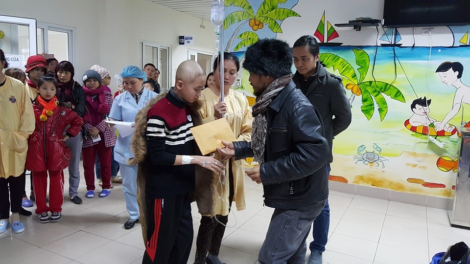 | Trần Lập và các bệnh nhi tại Bệnh viện K Tân Triều chiều 26/1. |