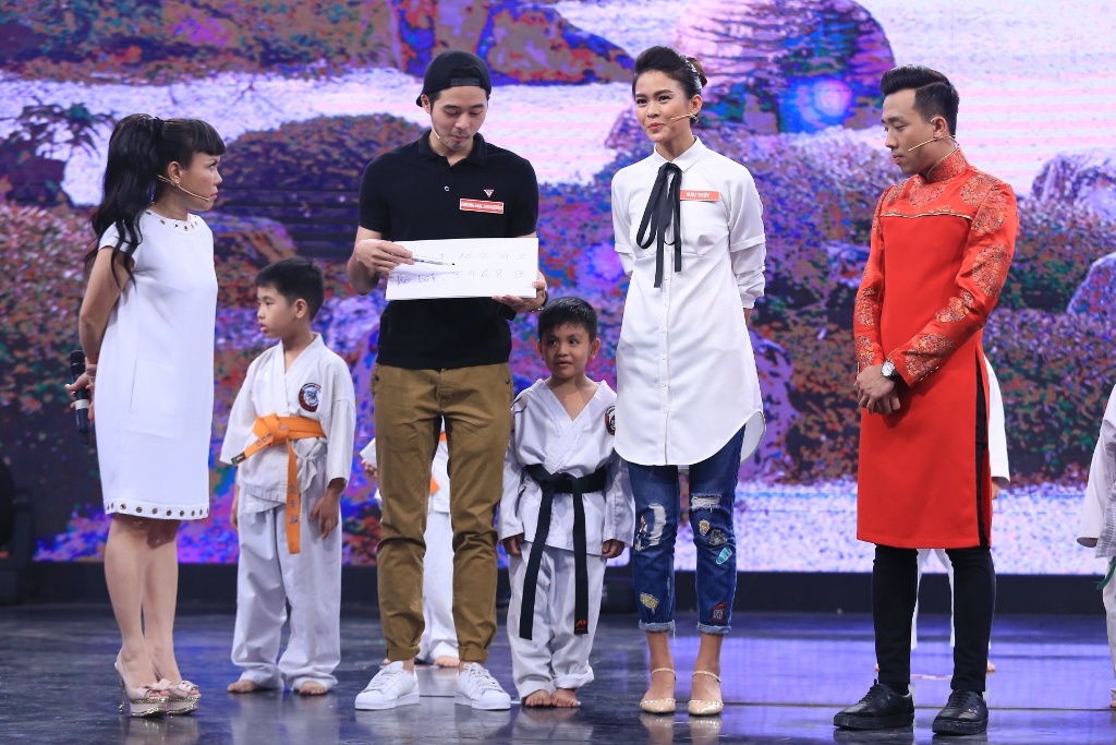 Mâu Thanh Thủy sốt ruột nên quyết đưa Mạc Anh Quân vào trò chơi đoán vận động viên karate nhí. Trong vòng một phút, nam người mẫu phải đoán trúng 10 bé. Không may mắn, anh lại đoán sai một bé nên 600 điểm chia đều cho ba đội còn lại. |