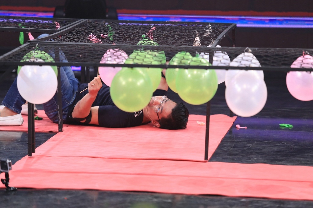 Mặc Trấn Thành, Việt Hương cổ vũ, nhưng Mâu Thanh Thủy chủ động nhường cho Quỳnh Trang vì cựu người mẫu quá "hăng máu". Trong vòng 100 giây, ông xã Xuân Hiển của chị phải trườn mình làm bể 50 bong bóng. Dù Trấn Thành chê ngoại hình "phô mai cuộn", anh vẫn hoàn thành mục tiêu trước thời hạn bằng nỗ lực bản thân. |