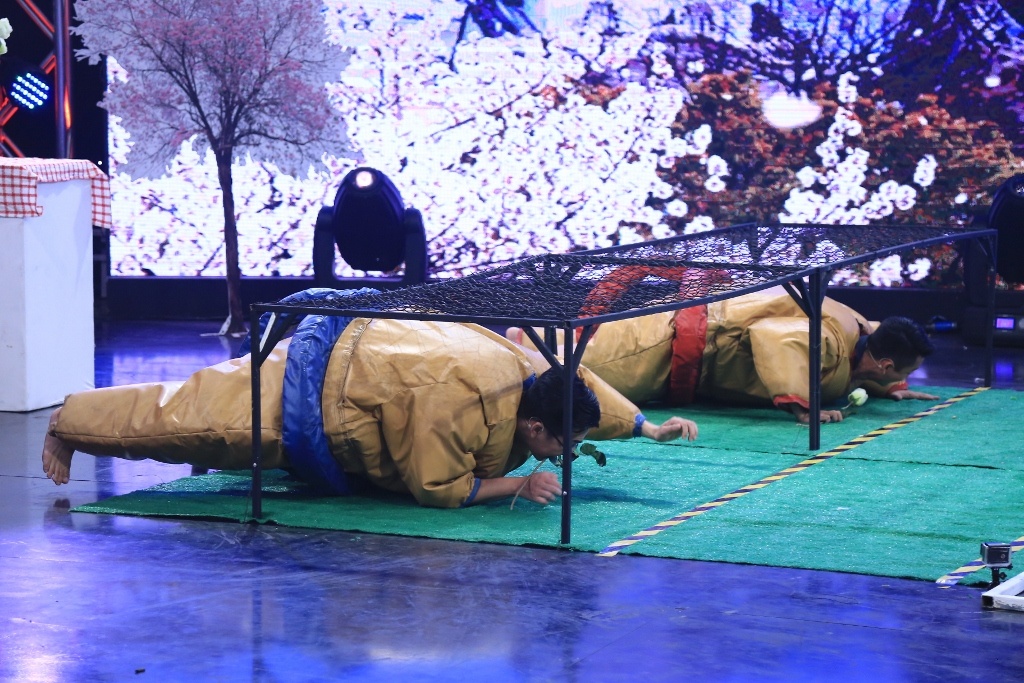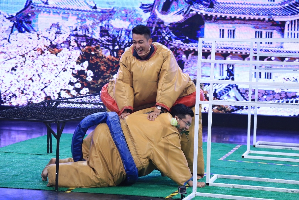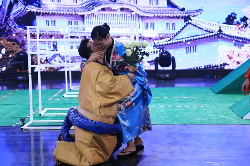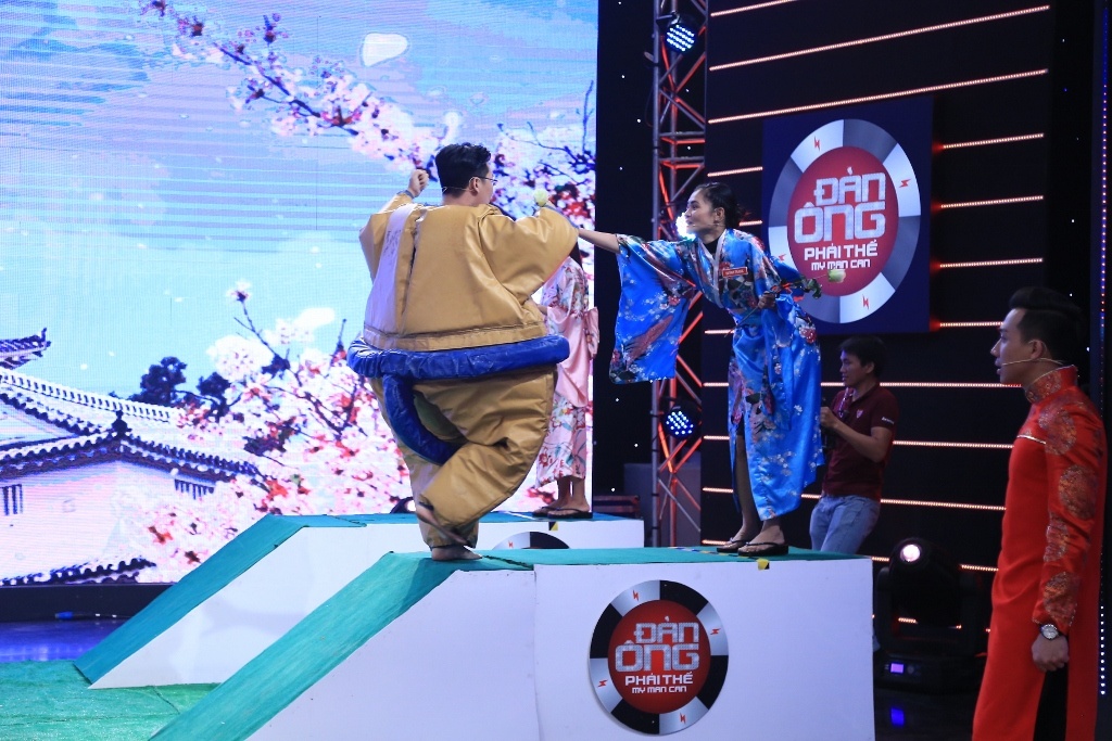 Cặp Khánh Ngọc - Lê Trung Cương và vợ chồng Quỳnh Trang bước vào vòng đặc biệt. Hai quý ông mặc trang phục sumo, vượt qua các chướng ngại vật và trao hoa cho quý cô đang đứng trên dốc. Mặc dù sở hữu ngoại hình vạm vỡ nhưng Trung Cương đã sớm bỏ cuộc vì đuối sức. |