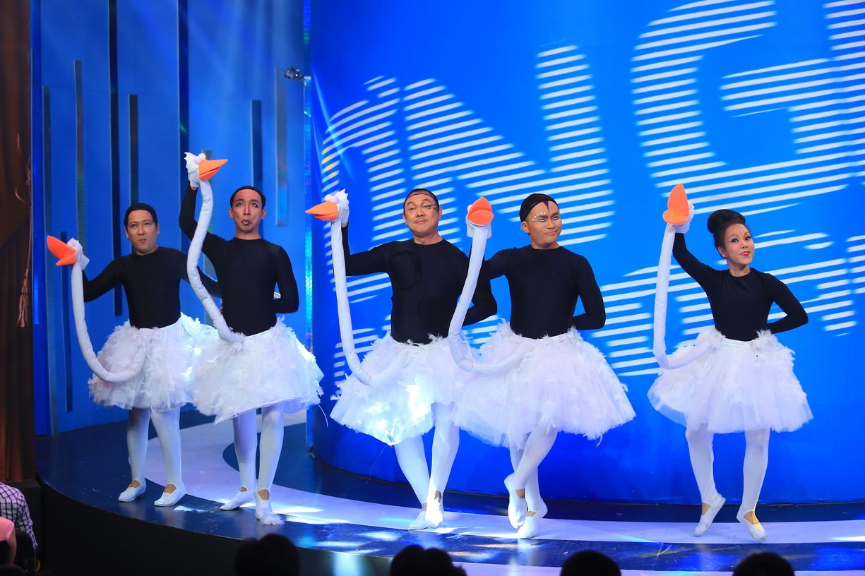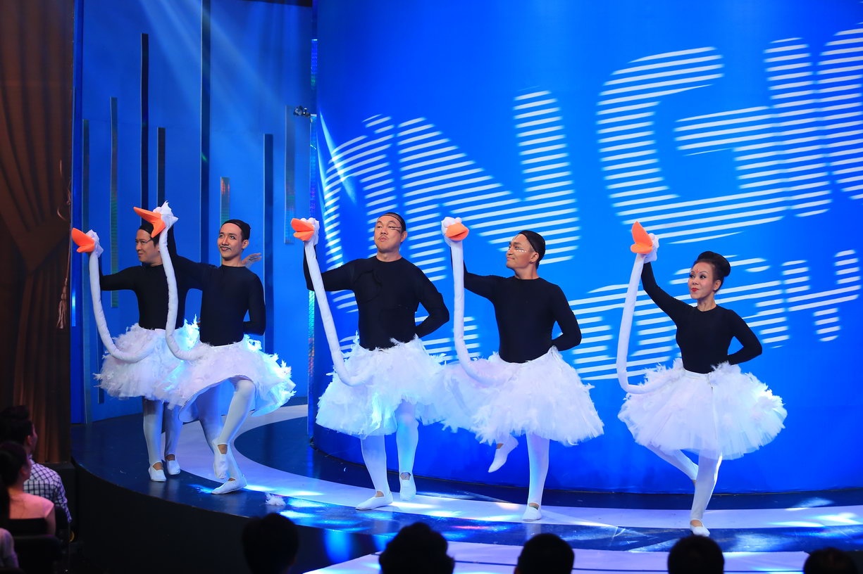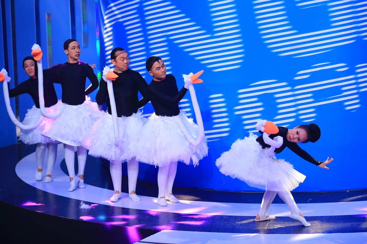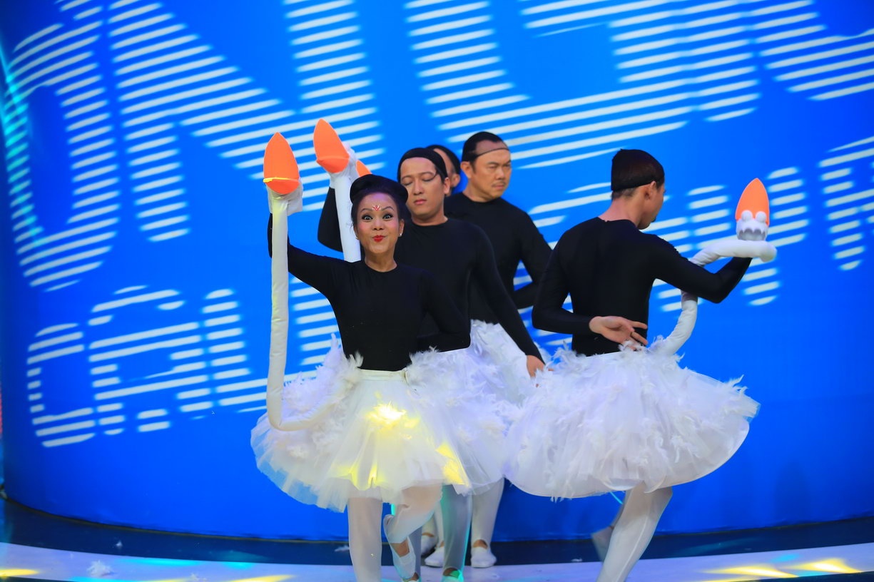 | Thiên nga mẹ Việt Hương khoe tài múa ba lê chuyên nghiệp và dẫn đàn con chân to của mình vào sân khấu. |