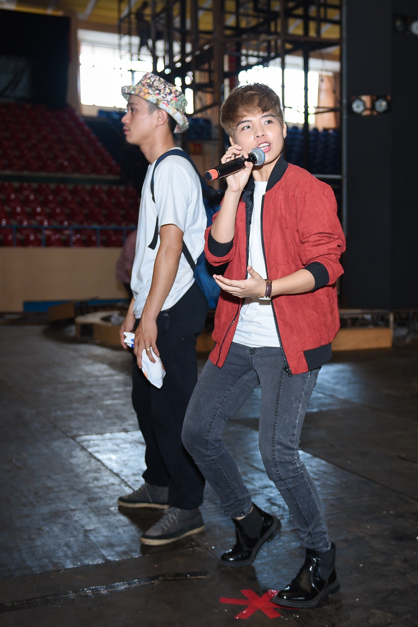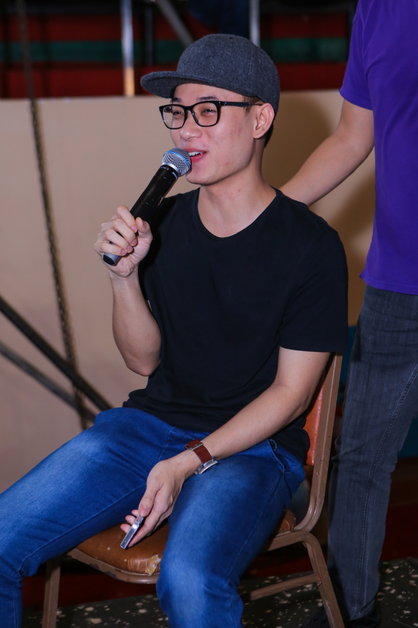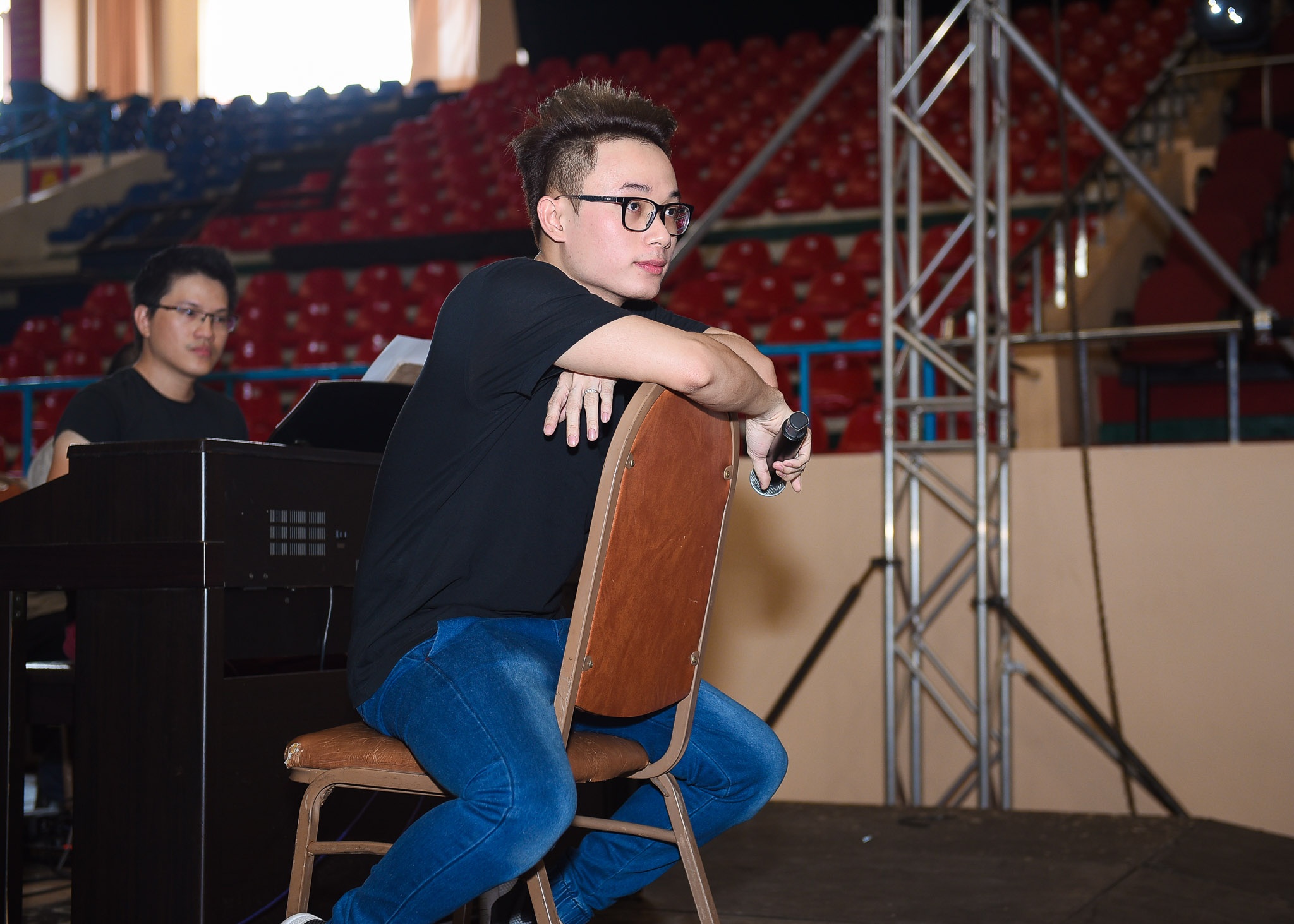 Phía trong sân khấu, Trúc Nhân vẫn miệt mài tập luyện cùng các cộng sự. Ở mùa giải thứ 5, giọng ca Thật bất ngờ từng bội thu giải thưởng nhờ hit Bốn chữ lắm. |