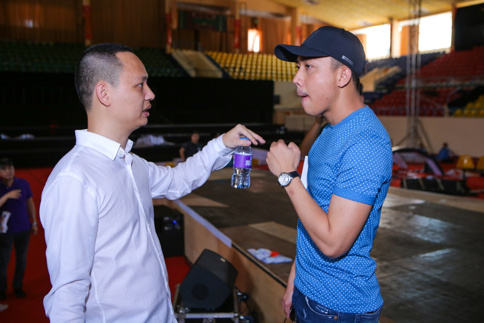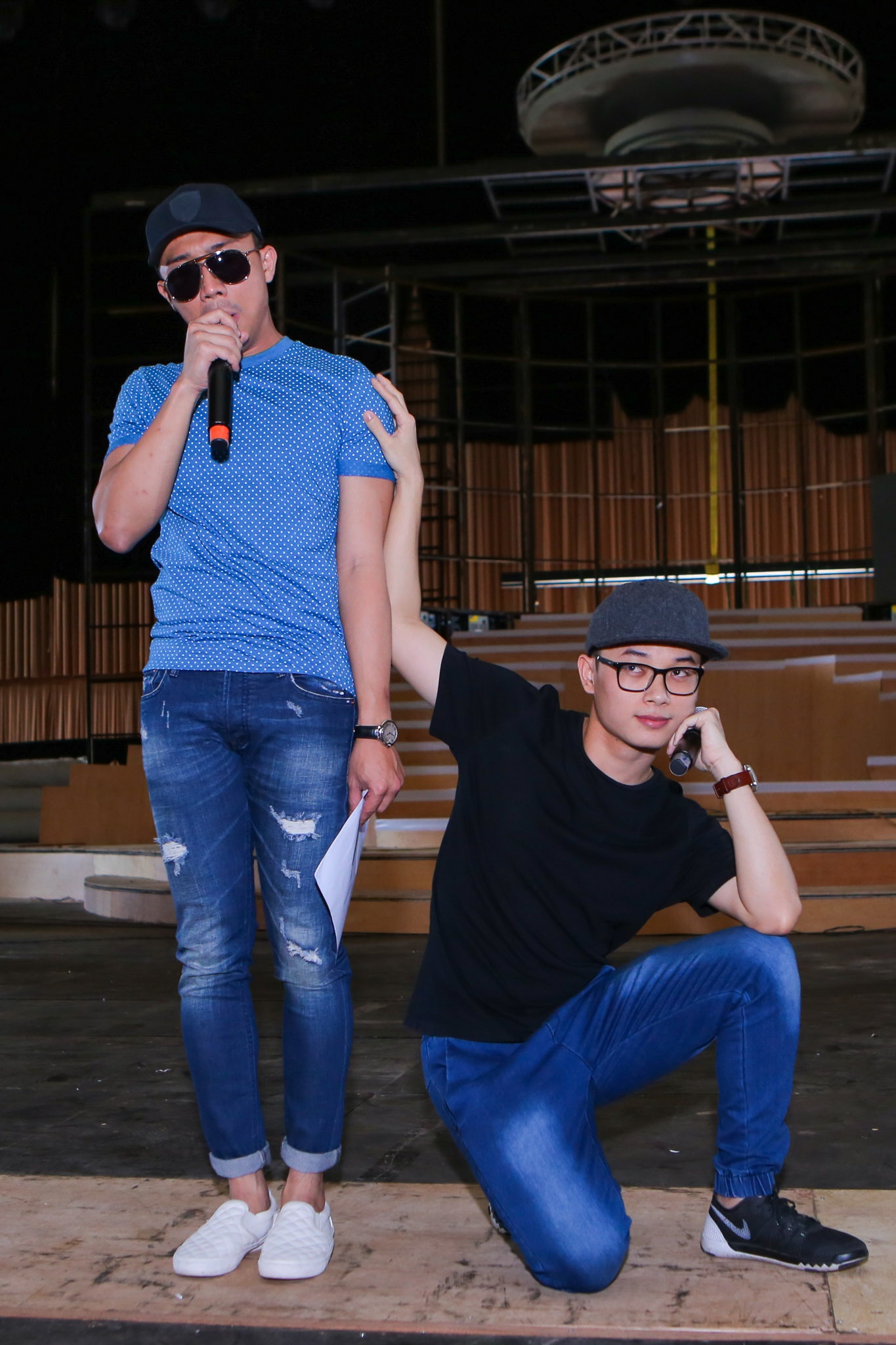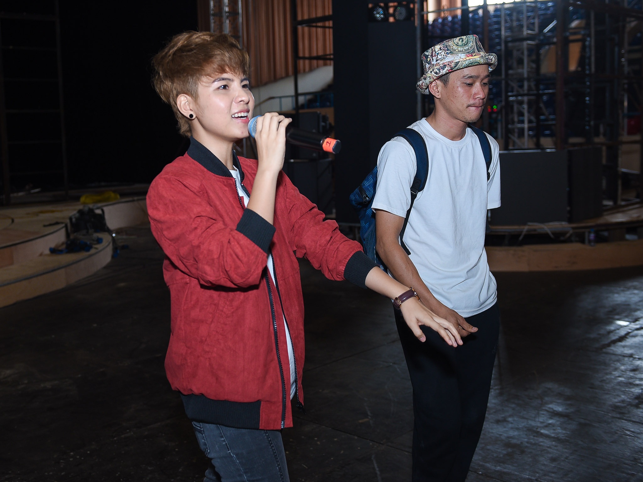 Trấn Thành và Trúc Nhân đùa giỡn trong buổi tập. |