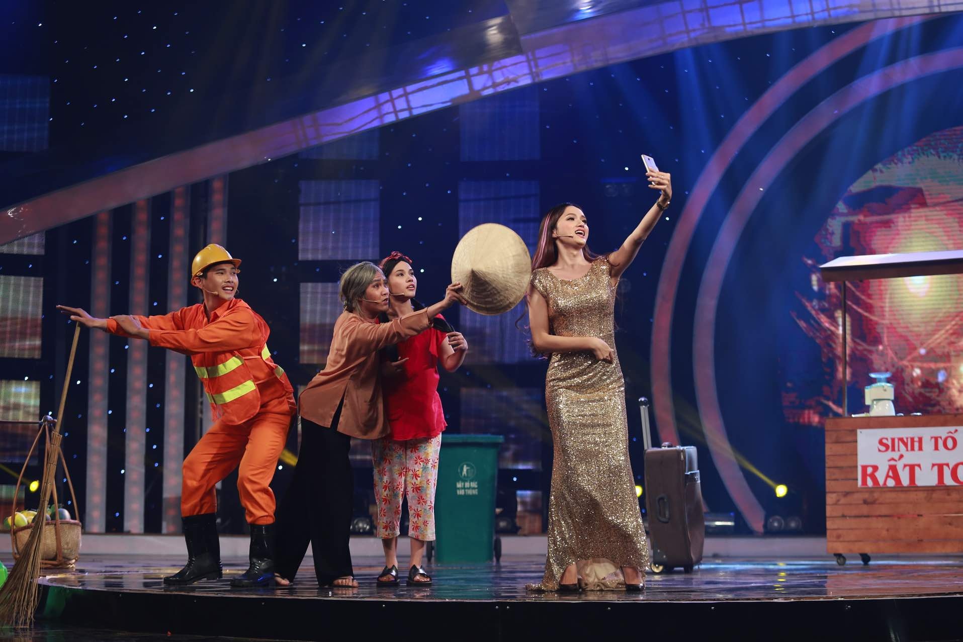 | Hương Giang Idol thể hiện khá tròn vai. Không chỉ mang đến tiếng cười, cô còn làm cả trường quay lắng đọng khi khép lại vở kịch bằng chia sẻ: "Mọi người thấy ca sĩ ở trên sân khấu, thấy ánh hào quang là như vậy đấy. nhưng họ cũng phải mưu sinh, có gia đình riêng, họ có việc gấp cũng phải dừng lại để chiều lòng khán giả”. |