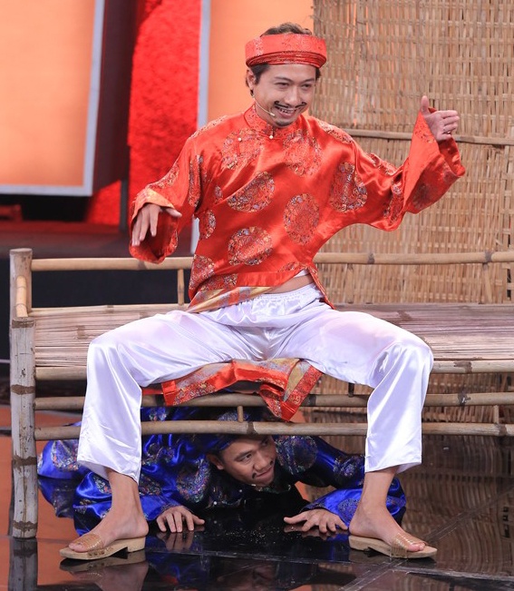 | Tuy nhiên, vì chưa kịp làm quen với sân khấu nghiêng nên Duy Khánh bị 2 đàn anh "hãm hại". Cả 2 liên tục đẩy nam diễn viên trẻ ngã lăn quay làm khán giả bật cười thích thú. |