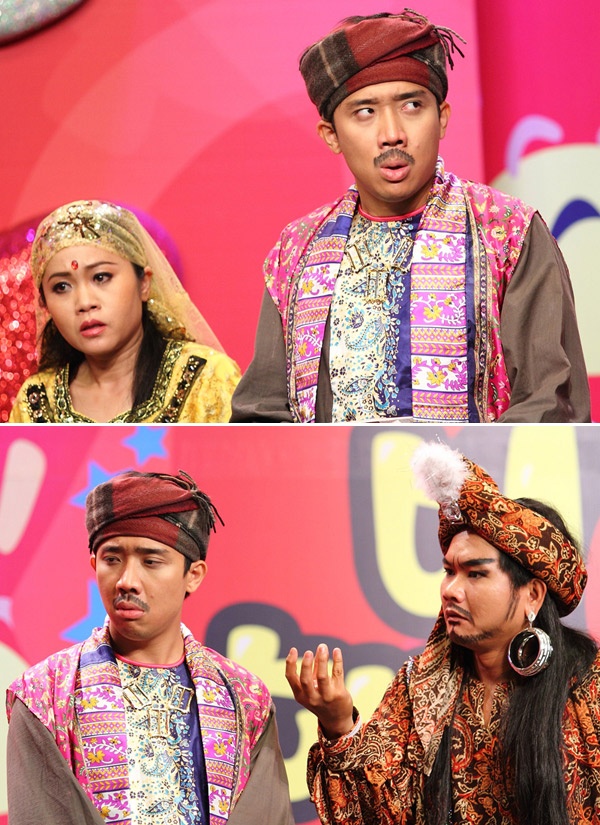 | Trấn Thành kết hợp với Kim Huyền, Phú Hải trong tiểu phẩm phóng tác truyện Alibaba và 40 tên cướp. |