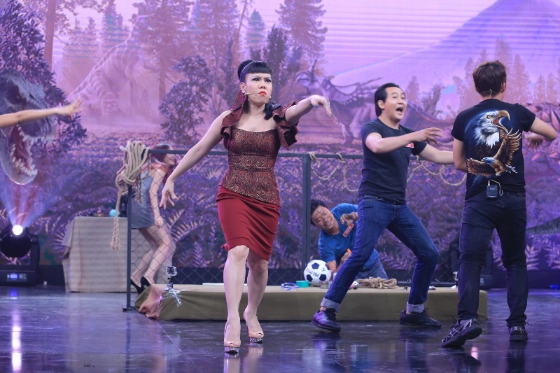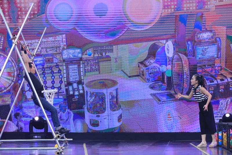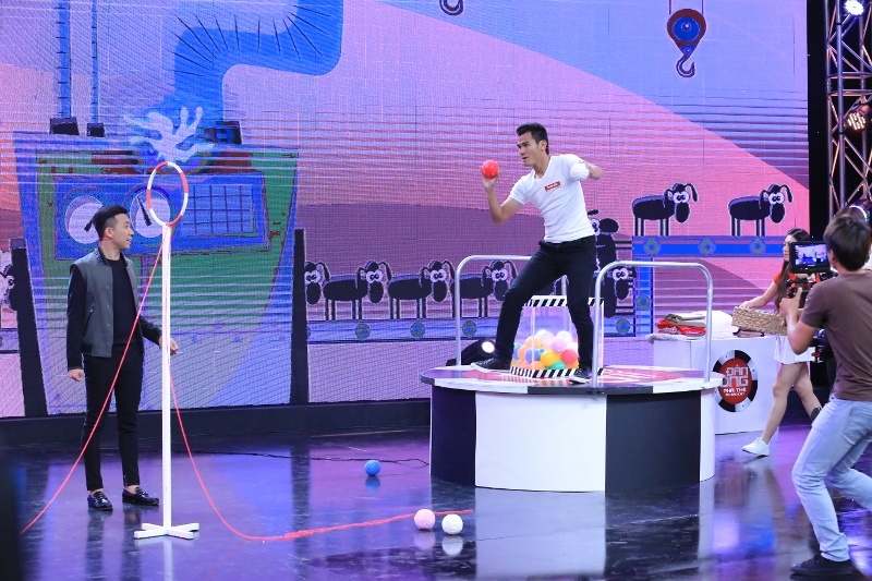 Sau khi vượt qua 3 trái đầu tiên, Phi Long bỏ cuộc vì không trụ nổi. Anh buông tay khỏi xà, đứng múa hát quay cuồng khiến cô bạn ném banh loạn xạ vì tức giận. |