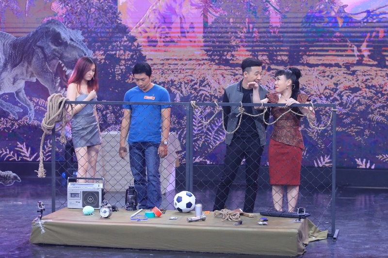 Thử thách 3 mang tên chuyển đồ qua lưới, người chơi phải luồn tay để lấy từng vật dụng đủ kích cỡ từ bên kia tấm lưới sắt. Vân Nhi hăng say đánh cược 17 món mặc Kinh Quốc ra sức phản đối. |