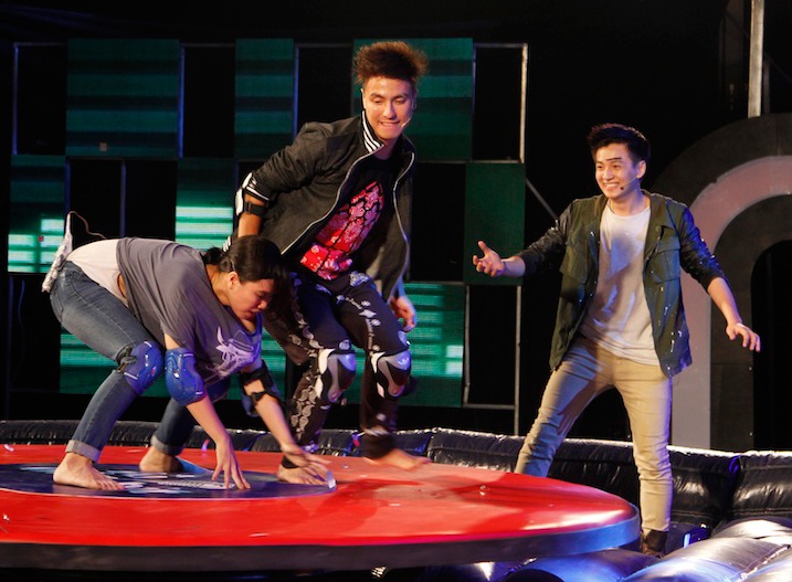 | Phải chuyển trái cây từ đầu cầu bên này sang cầu bên kia, Tăng Nhật Tuệ vẫn dễ dàng vượt qua dù liên tục bị anh chàng lém lỉnh Ngô Kiến Huy làm cây cầu lắc lư. |