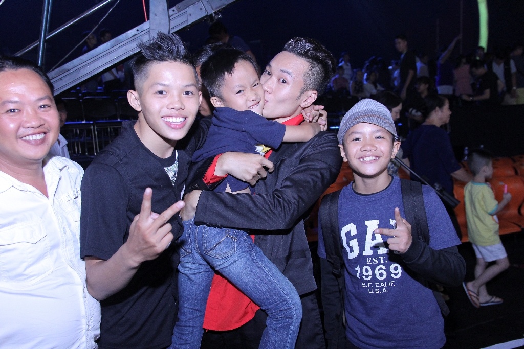 Ba vũ công nhí Lê Hiếu, Lê Huy, Lê Hào (được Phi Hải nhận nuôi) sung sướng chúc mừng "ba Bin" thoát hiểm. |