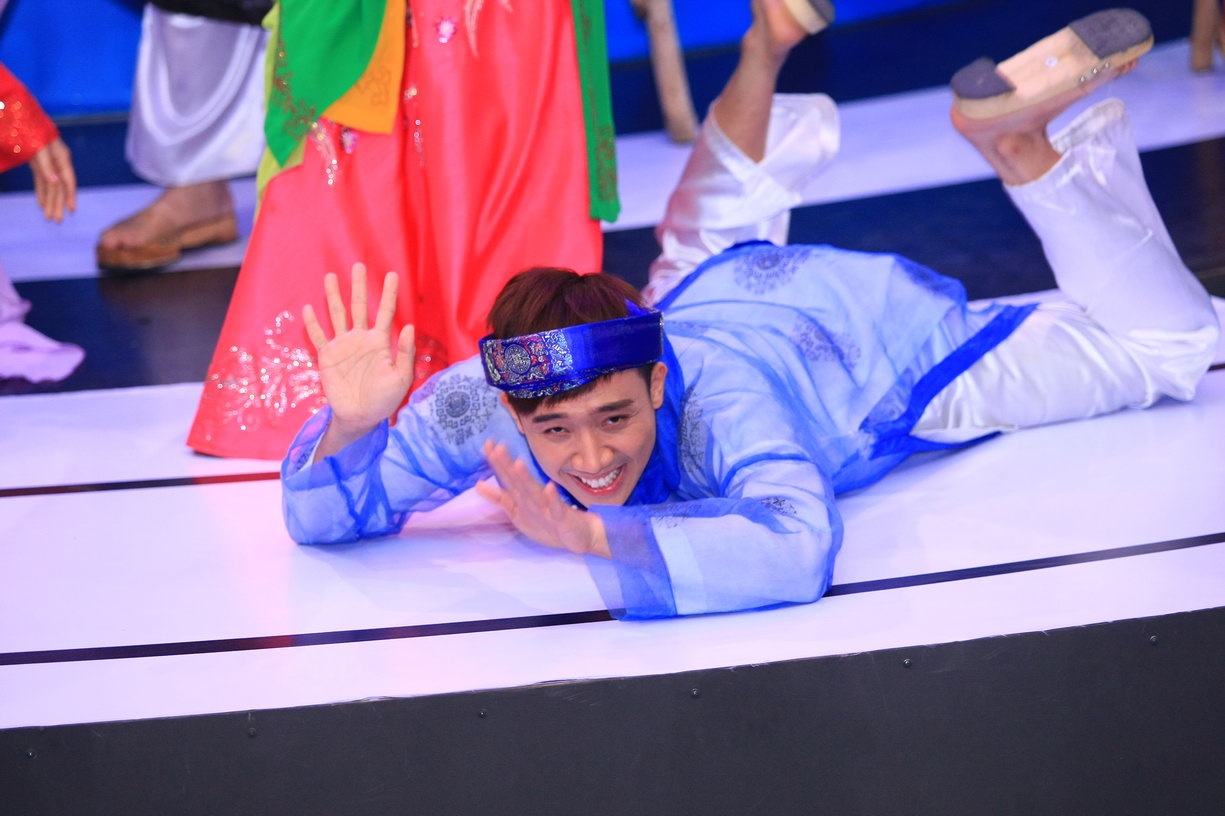 | Để tạo thêm phần vui nhộn trong tiết mục mở màn, Trấn Thành tự té ngã và nằm dài trên sân khấu. |