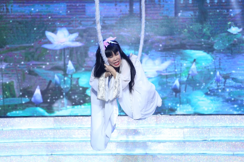 | Việt Hương làm khán giả bất ngờ khi xuất hiện từ trên cao xuống sân khấu. |