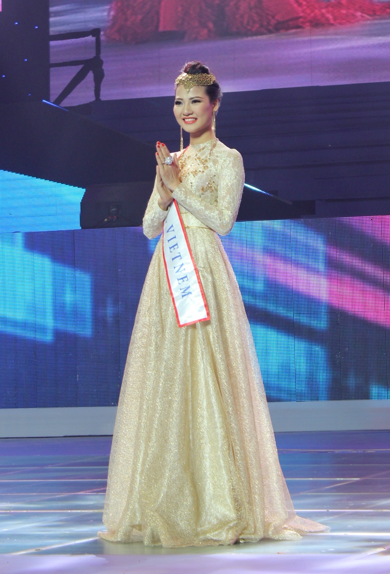 Trần Thị Quỳnh ghi điểm ở phần thi trang phục dân tộc nhờ hình ảnh áo dài duyên dáng.