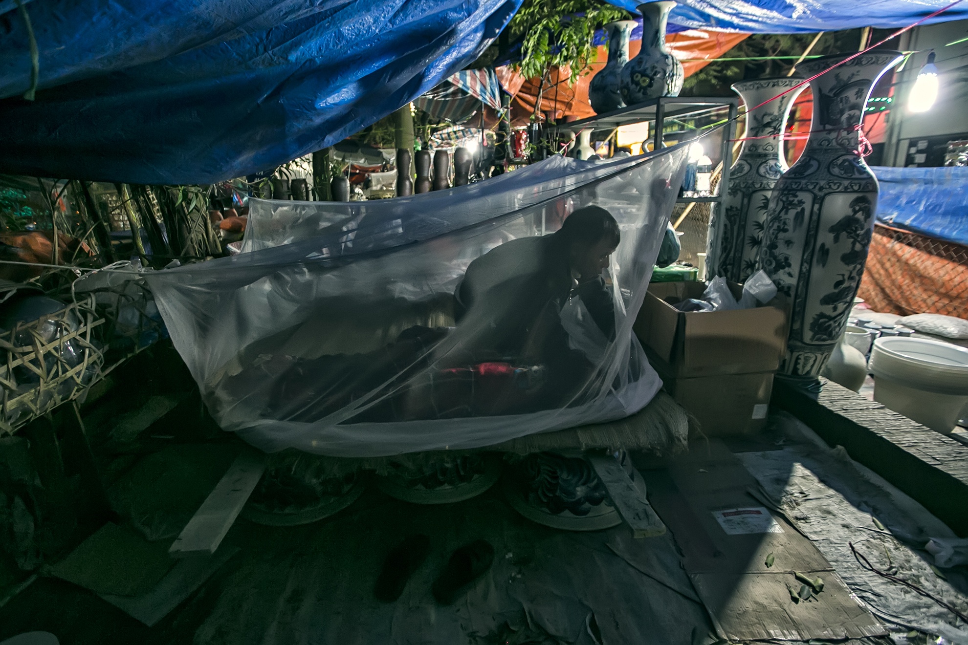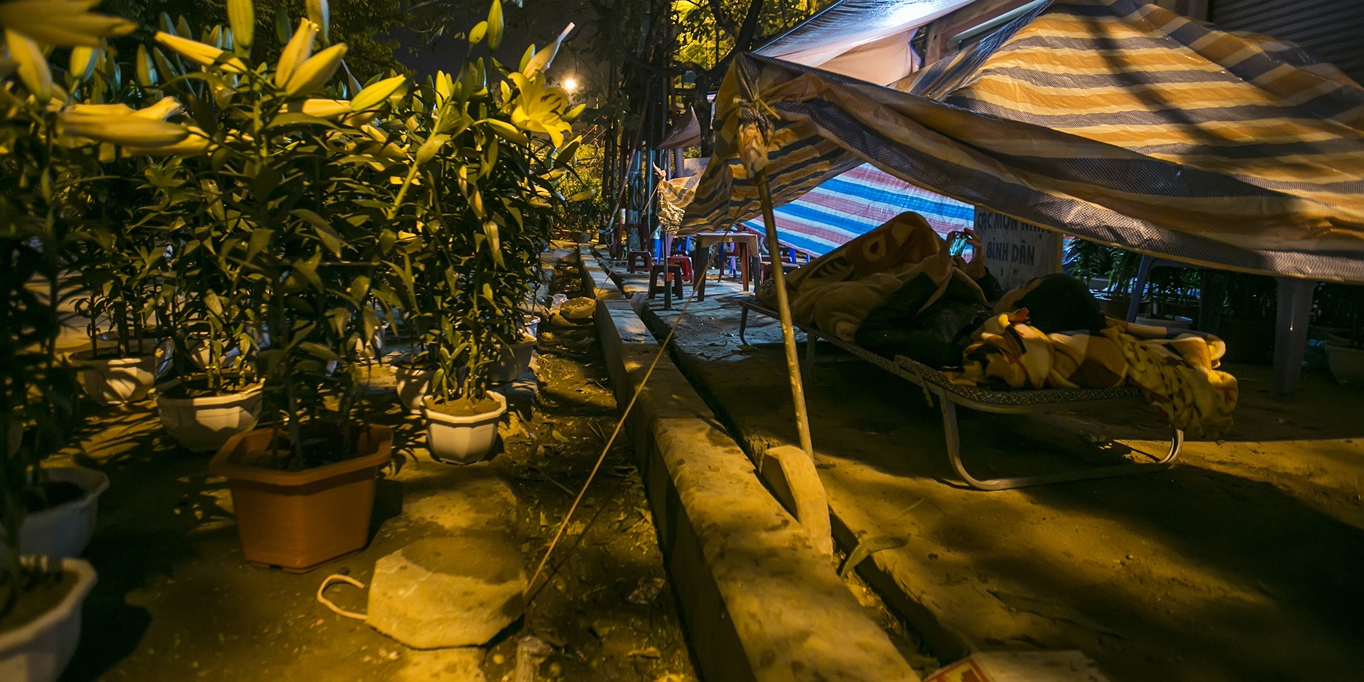 22h30 tối 28 tháng Chạp tại chợ hoa cây cảnh Hà Đông (Hà Nội), anh Hùng (48 tuổi) – người buôn gốm từ làng Kim Lan (Bát Tràng, Gia Lâm) đến thủ đô, mắc màn chuẩn bị đi ngủ. Giường của anh kê bằng những chậu cây cảnh chưa bán được.