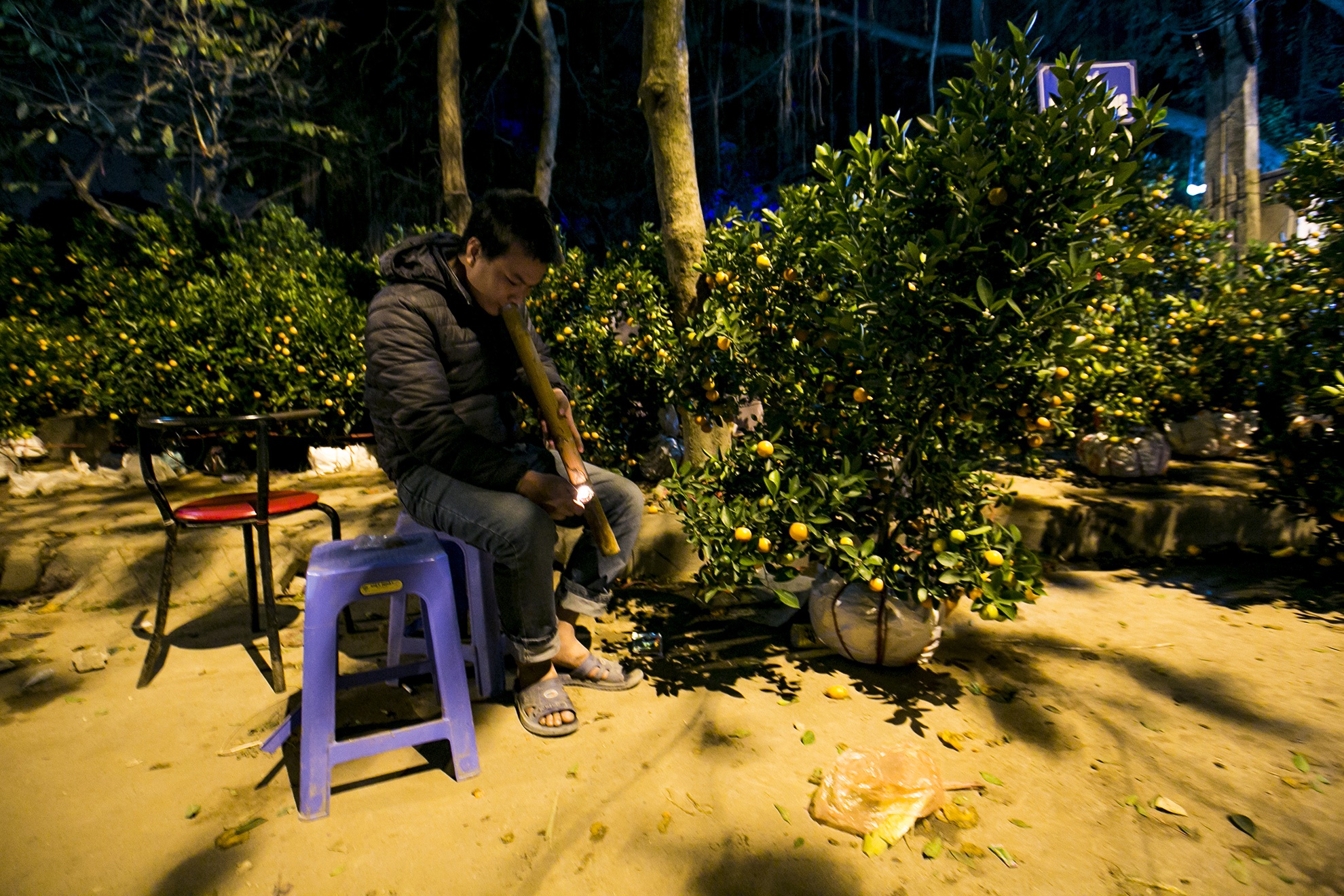 Không phải ai cũng ngủ và trông cây cối. Người bán quất của gian hàng này đã bỏ đi từ chập tối, mặc kệ hàng cho bà con xung quanh coi hộ.