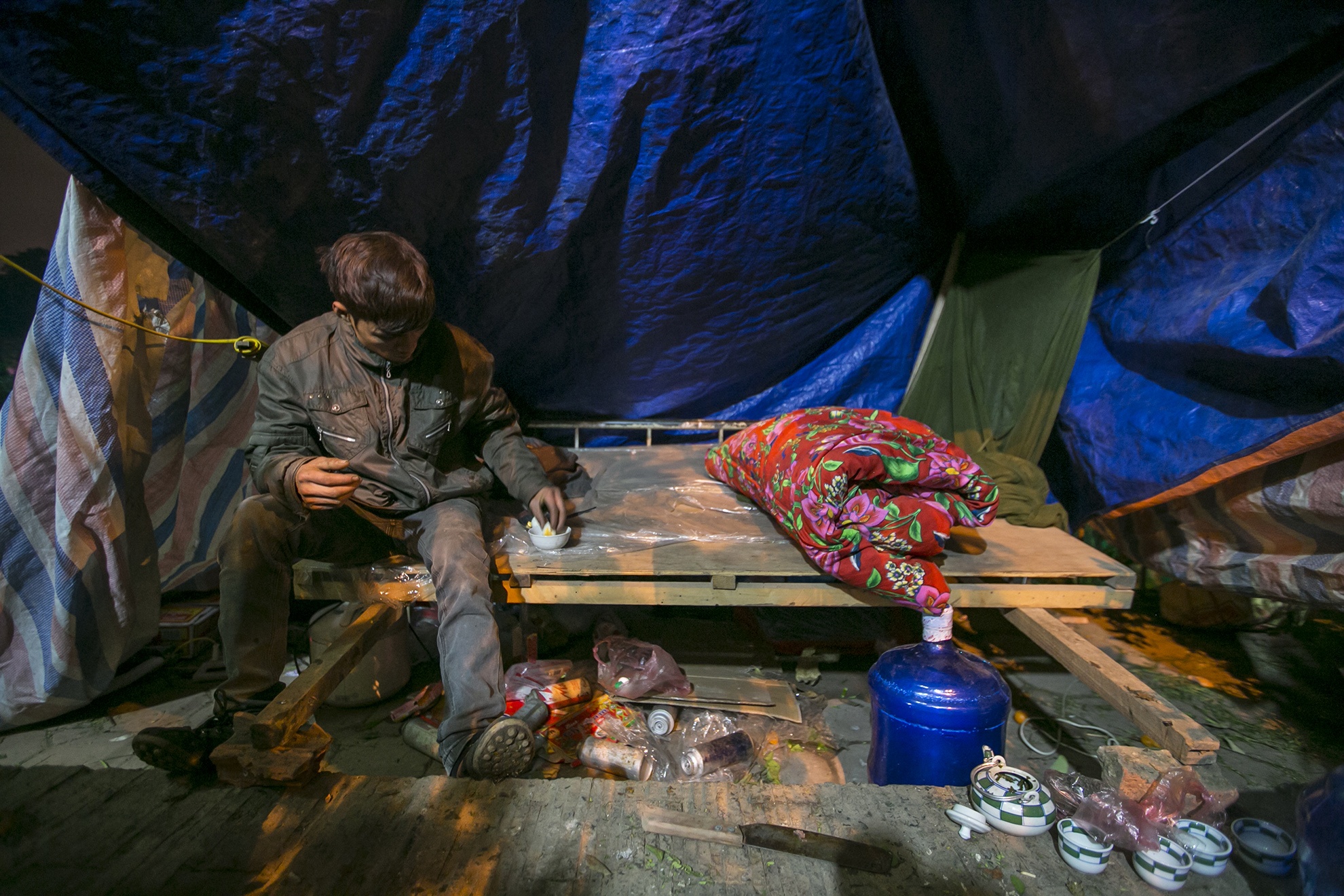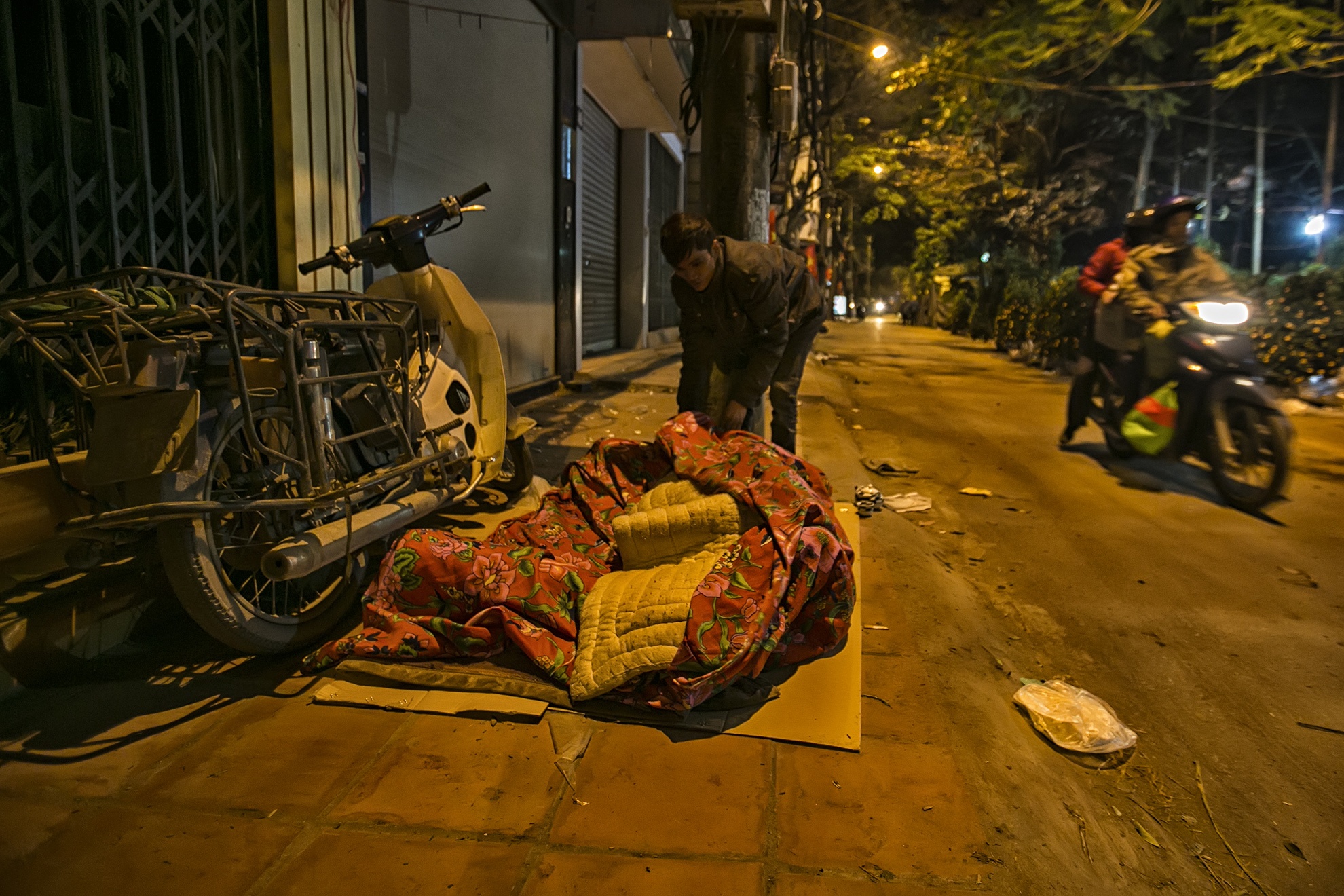 | Sau khi no bụng, sắp xếp tạm chỗ ngủ trên vỉa hè. |