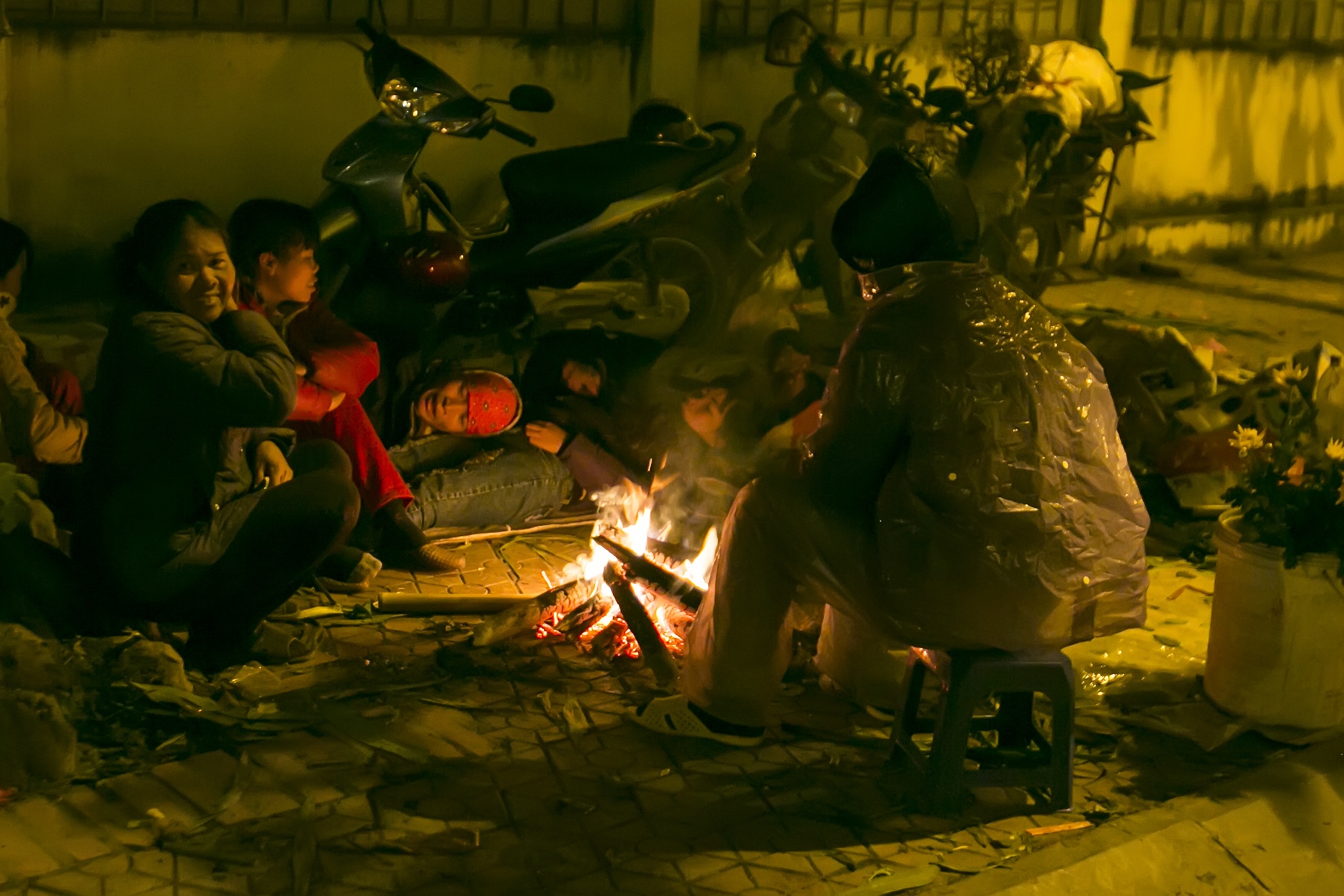 Tại chợ cây cảnh, cánh đàn ông thường chỉ nằm một mình, riêng với phụ nữ lại khác. Các chị bán hoa nằm kê lên nhau quanh đống lửa. Một người chia sẻ: “ Thà nằm quanh đống lửa để nẻ toác mặt còn hơn là chịu rét”