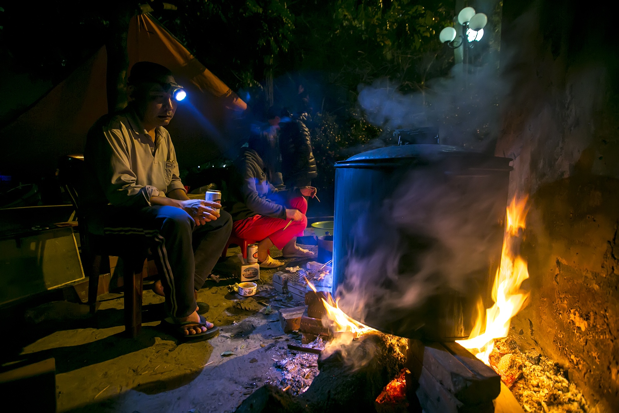 Đêm cuối cùng canh giữ hoa, tiểu thương tại chợ Hà Đông kê tạm chậu cây cảnh làm giường, đốt củi sưởi ấm để vừa trông hàng vừa chợp mắt qua đêm.