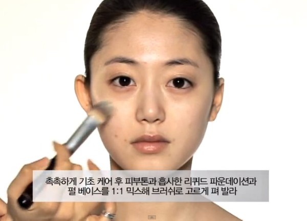 Bước 1: Trộn đều kem lót và kem nền theo tỉ lệ 1:1 rồi dùng cọ tán đều lên mặt. Bạn nên dùng cọ dặm nhẹ nhàng lên mặt để lớp kem được đều màu và tăng độ bám.