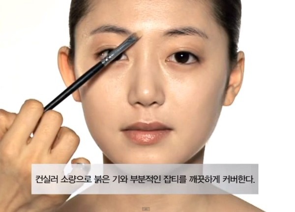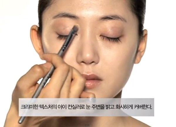 Bước 3: Đối với vùng mắt, dùng kem che khuyết điểm và cọ tán đều lên bầu mắt trên và bọng mắt dưới để che đi toàn bộ quầng thâm của mắt.