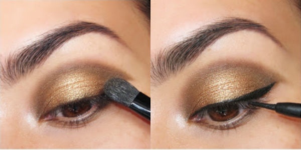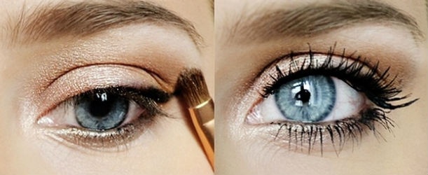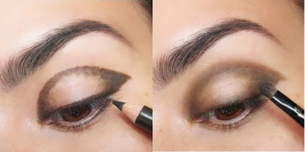 Kiểu trang điểm kể trên sẽ hợp để bạn xuống phố vào ban ngày, còn vào buổi tối, bạn nên chọn cho mình một kiểu trang điểm ấn tượng hơn để có thể nổi bật trong đêm tiệc. Đầu tiên, hãy dùng chì kẻ mắt nâu đen vẽ một đường cánh cung bao bên ngoài bầu mắt như hình bên tay trái. Tiếp đó, dùng cọ tán đều màu.
