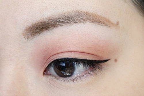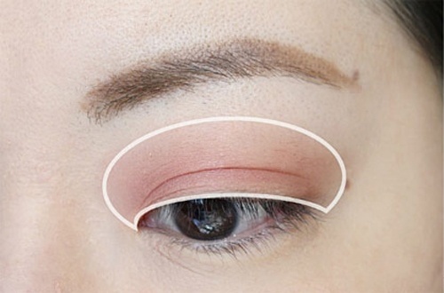 | Bước 2: Dùng phấn mắt tone hồng nhạt đánh cho toàn bộ phần mí trên, chú ý đánh đều tay. |