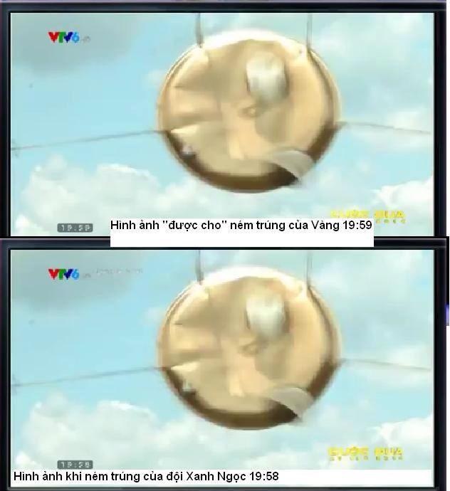 | Khoảnh khắc trái dừa trúng mục tiêu của đội Xanh Ngọc (trên) và đội Vàng (dưới) hoàn toàn giống nhau. Ảnh do Zing.vn chụp màn hình. |