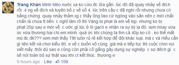 Trước đó, Trang Trần từng một lần "tố" Vàng phạm luật khi ôm cả balô lên xe chứ không để ở cốp như yêu cầu của ban tổ chức nhưng cũng không bị phạt.