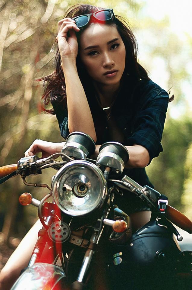 | Nữ người mẫu diện áo sơ-mi, quần short cá tính khi ngồi trên xe máy. |