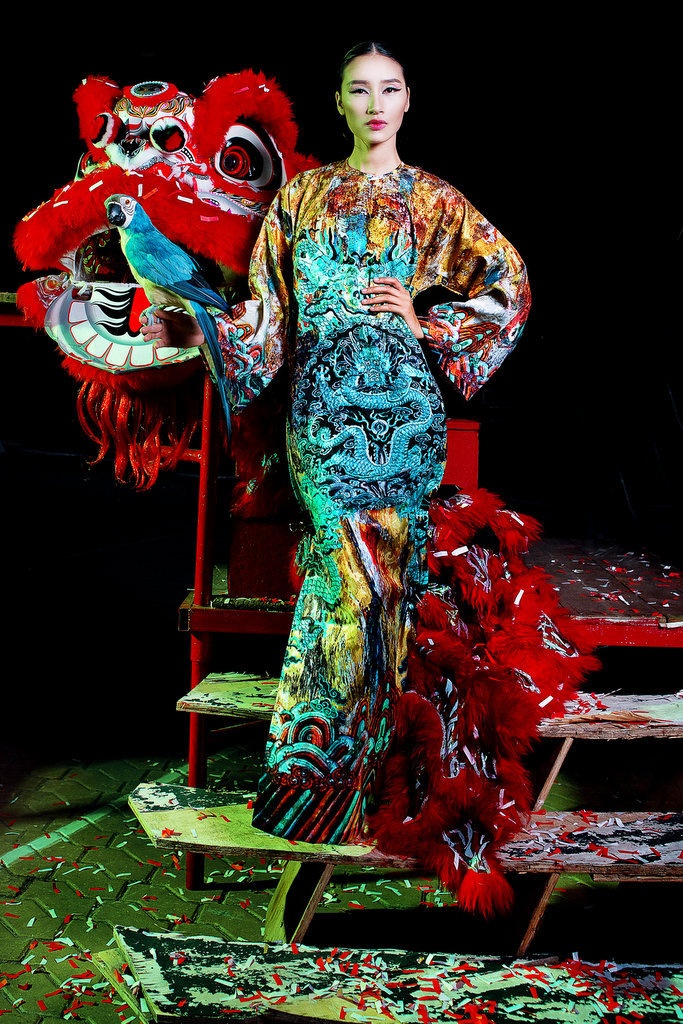 Chân dài trưởng thành từ cuộc thi Next Top Model tạo dáng bên chú lân khổng lồ.