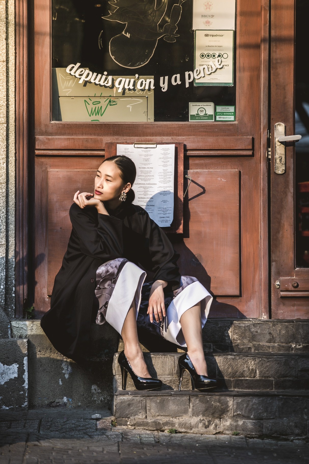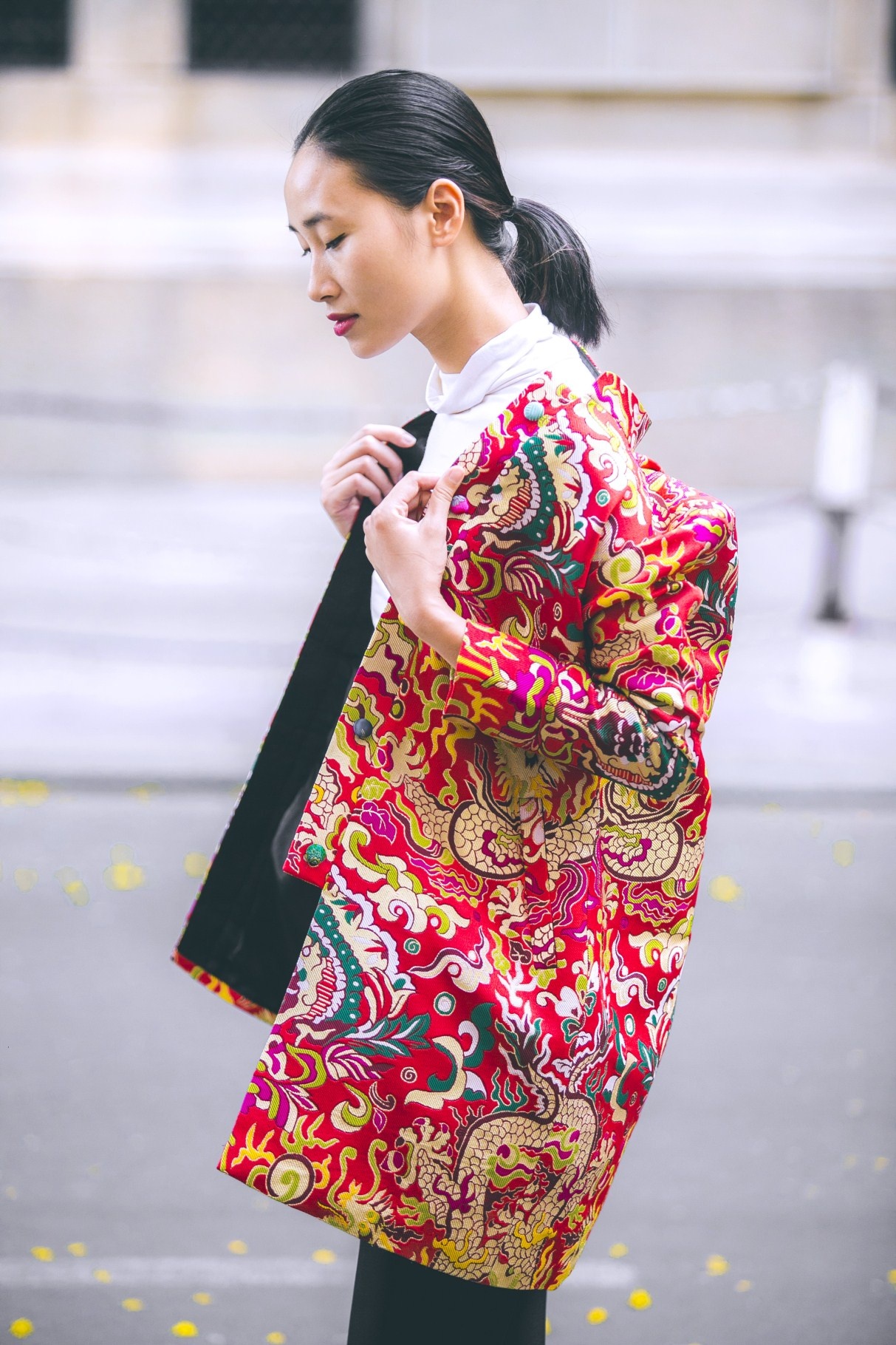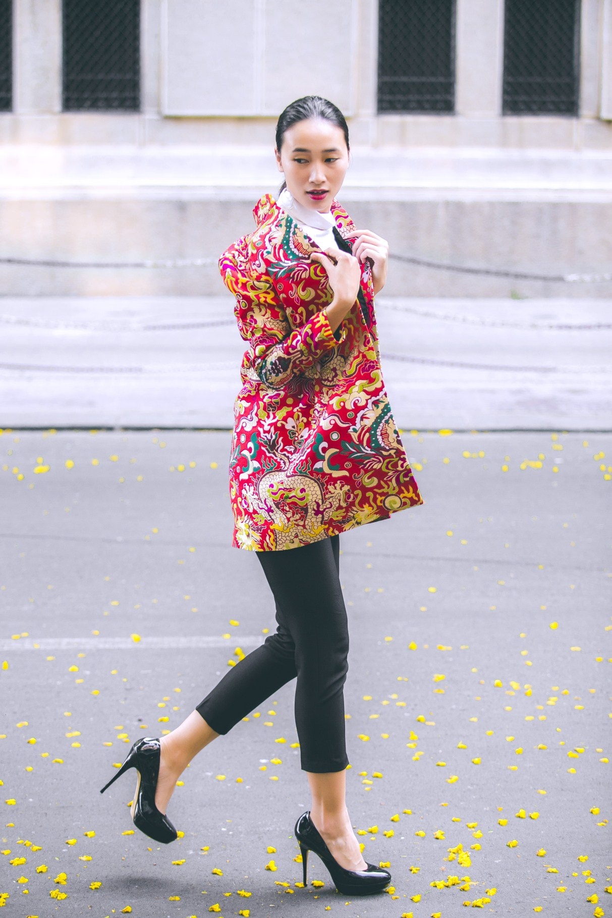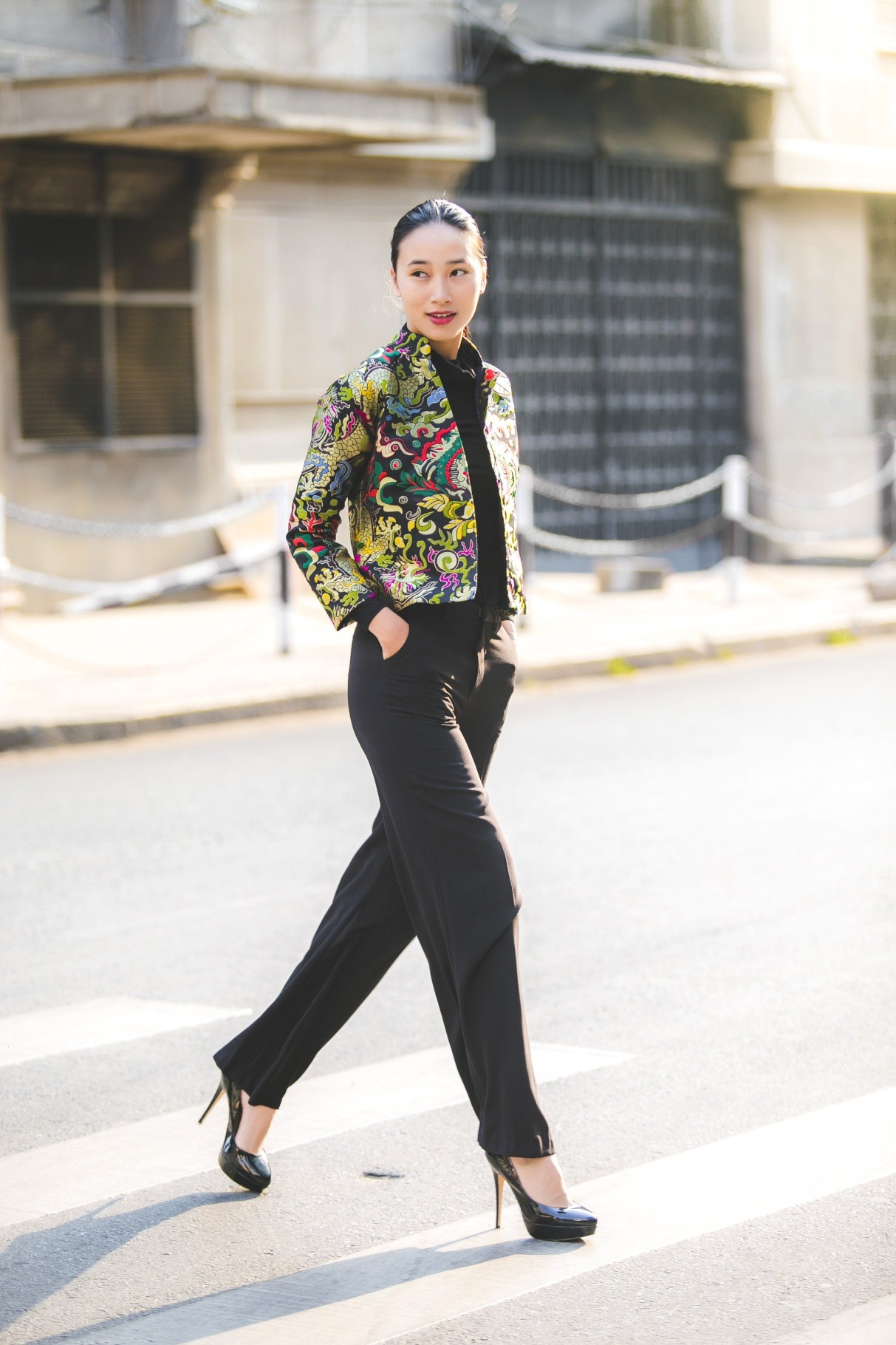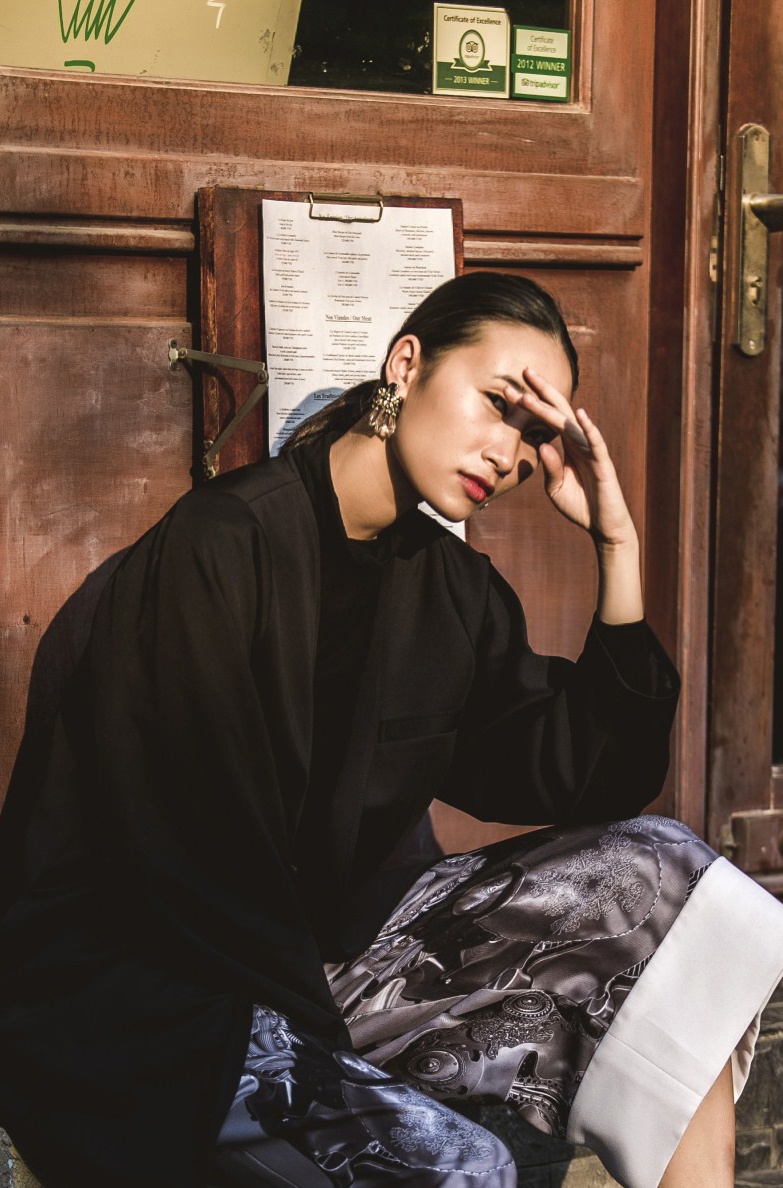 | Khi thực hiện hình ảnh mới, đậm màu sắc mùa xuân, người mẫu chọn trang phục chất liệu gấm hoa, họa tiết cổ truyền, kết hợp cùng set đồ hiện đại, mang lại hình ảnh mới mẻ khi tản bộ trên đường phố xuân 2015. |