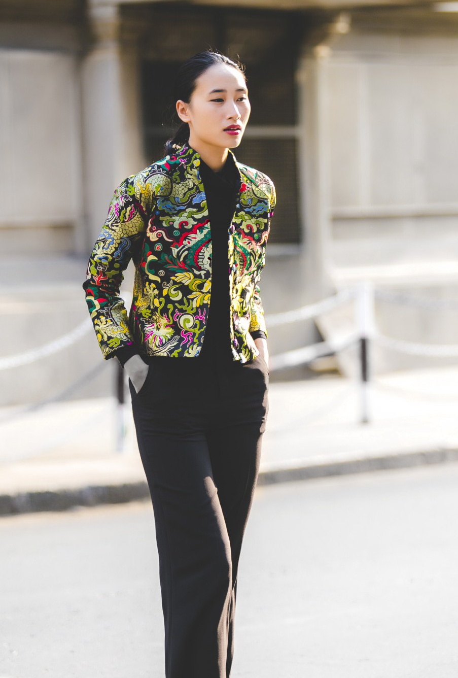 | Là nhà thiết kế khởi đầu xu hướng diện trang phục gấm hoa xuống phố, Thủy Nguyễn cho ra đời nhiều kiểu mốt nổi bật, đa dạng về màu sắc và họa tiết đậm nét truyền thống. Trong ảnh, người mẫu tản bộ với set trang phục áo jacket tông màu xanh lá đậm chủ đạo, họa tiết rồng phượng được thêu tỉ mỉ trên thân áo. |