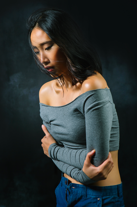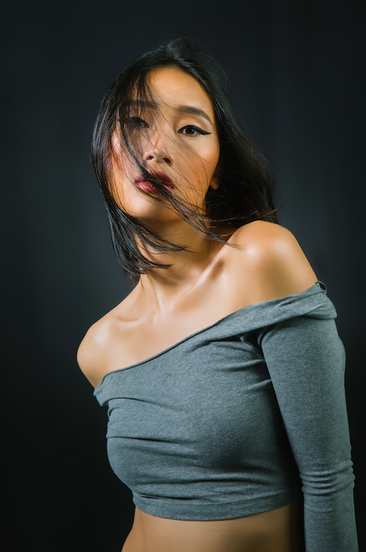 Làn da nâu tự nhiên và gương mặt góc cạnh giúp Trang Khiếu thể hiện thành công bộ ảnh cá tính, mạnh mẽ. Nữ người mẫu diện trang phục đơn giản, áo thun crop-top khoe eo thon, vai trần cuốn hút.