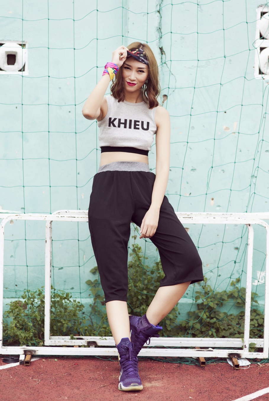 | Áo crop-top khoe vòng eo thon gọn. Giày thể thao màu tím làm điểm nhấn phối ăn ý cùng quần lửng chất liệu thun co giãn thoải mái. |