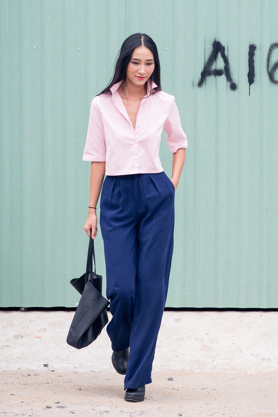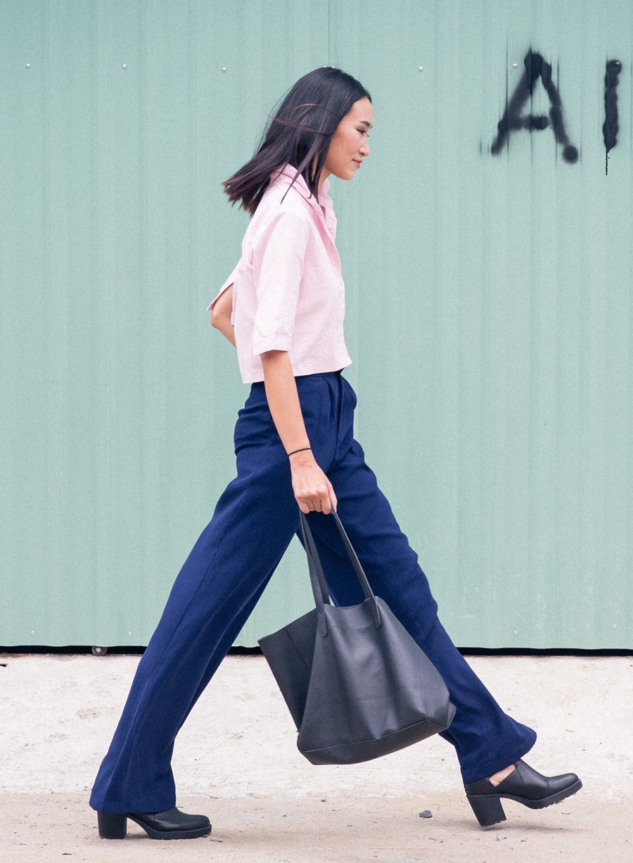 | Quần ống rộng, áo crop-top và phụ kiện đơn sắc toát lên tính cách người mặc. Cô không màu mè và kiểu cách. |