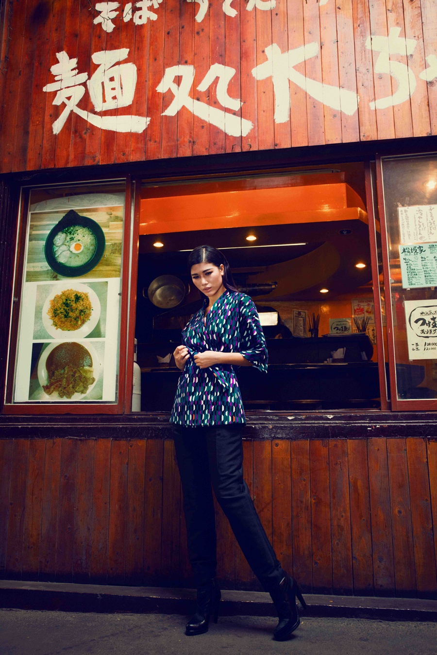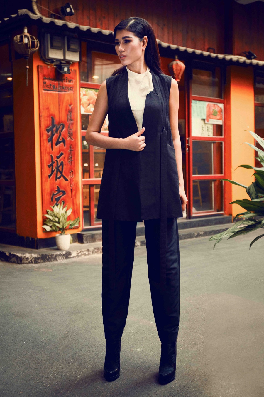 | Bộ cánh tông đen tuyền thanh lịch và gợi nhớ đến những trang phục Nhật Bản điển hình. |