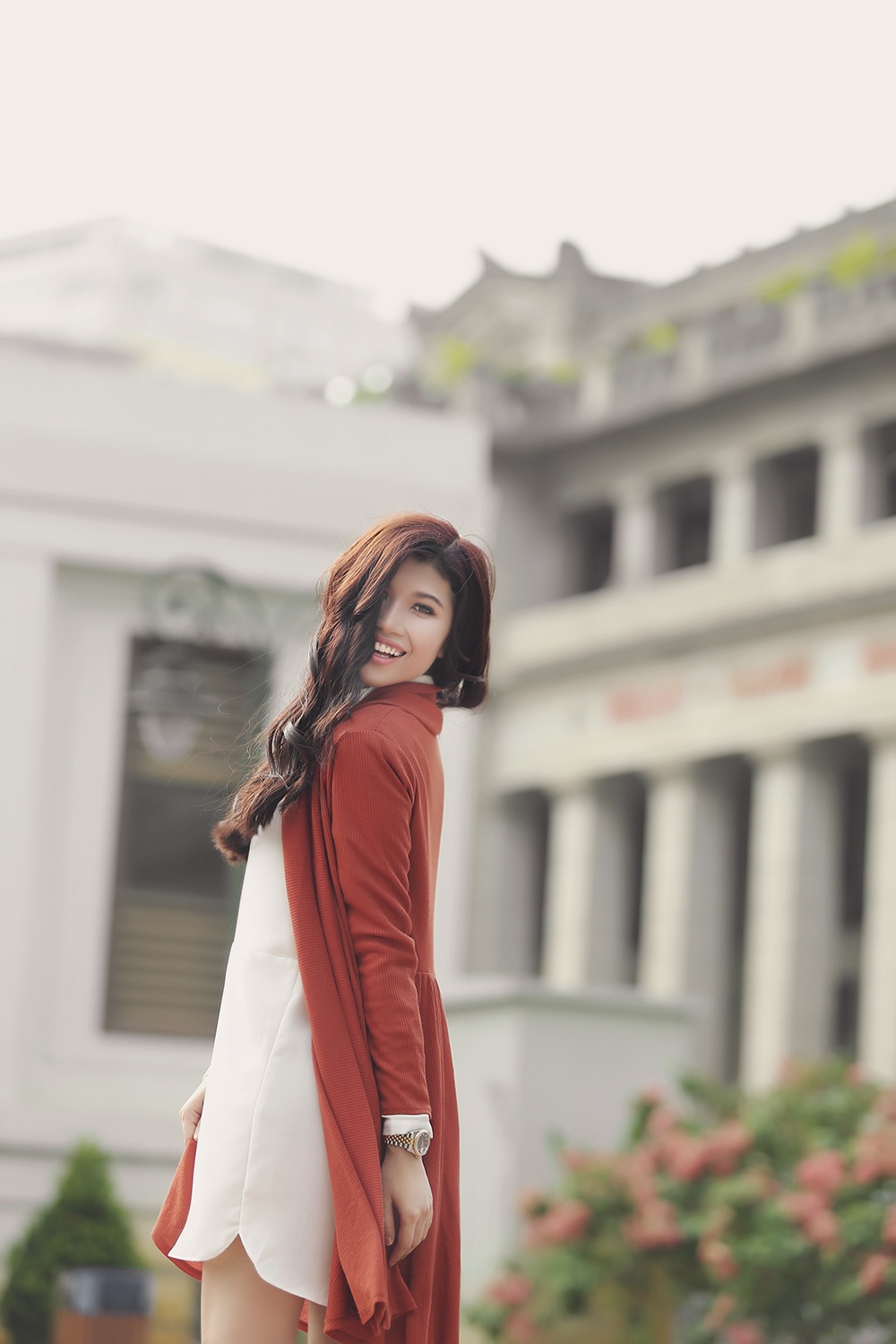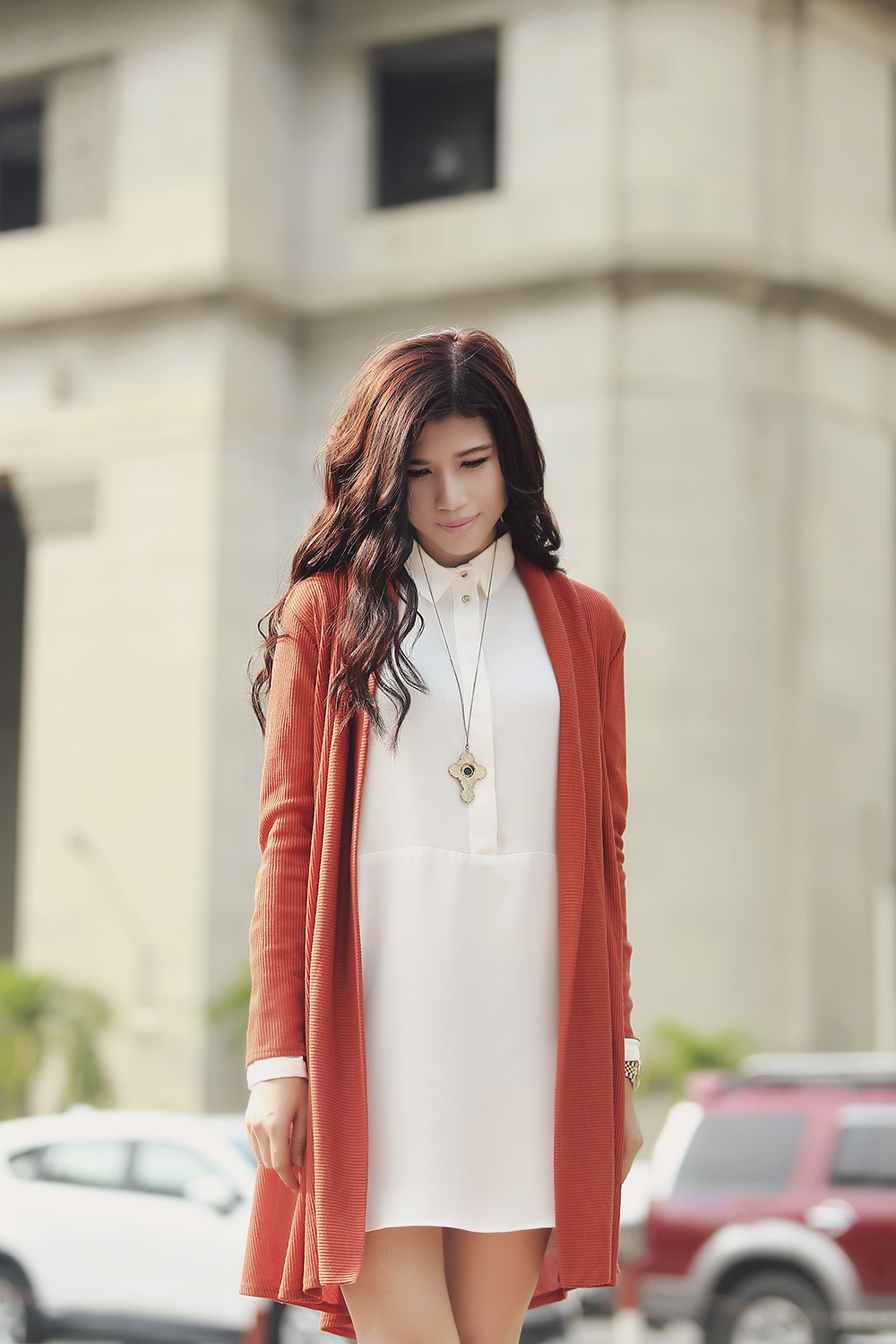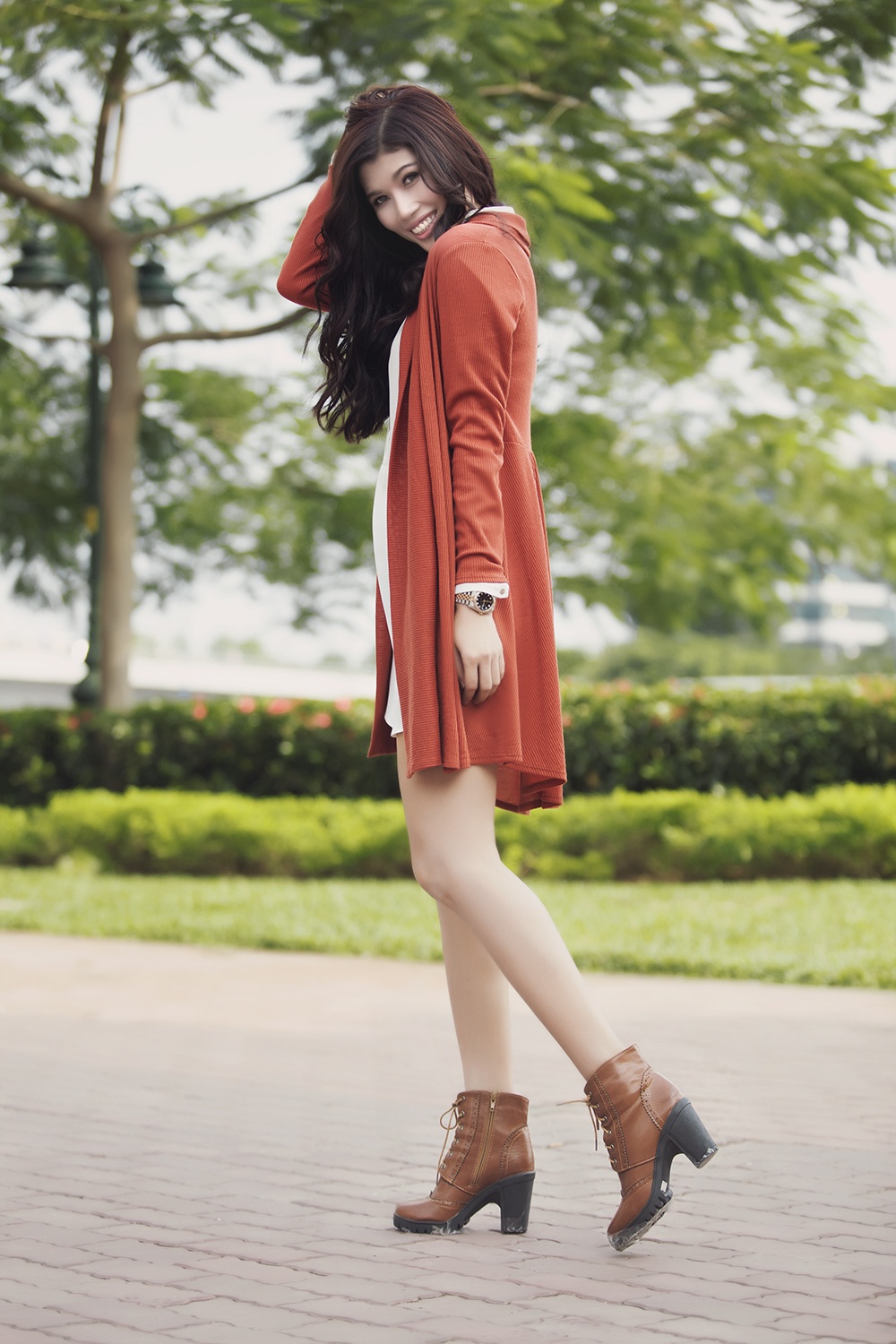 | Bộ ảnh mới được thực hiện ghi lại những hình ảnh mới với phong cách thời trang quen thuộc, được nữ người mẫu yêu thích. Cô diện set trang phục áo suông dài, kèm cardigan màu ấm áp, boots cổ ngắn. |