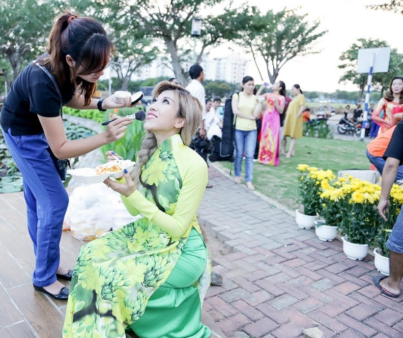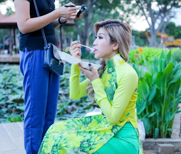| Trong lúc make-up, Trang Pháp tranh thủ ăn trưa và sau đó bắt đầu quay video mà không có thời gian nghỉ ngơi. |