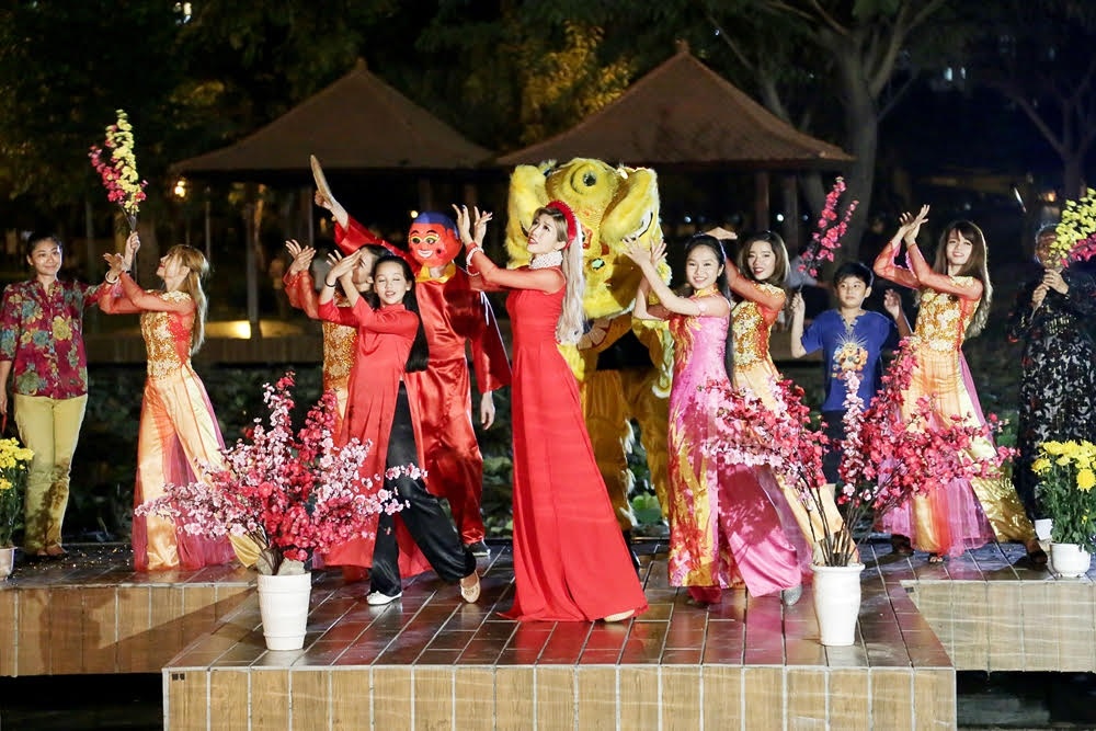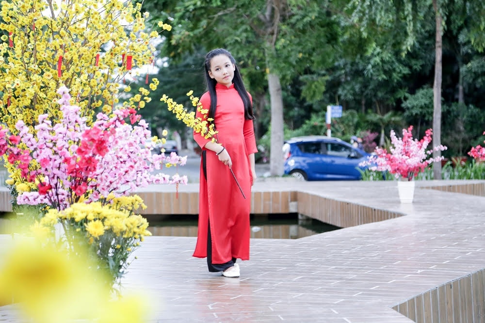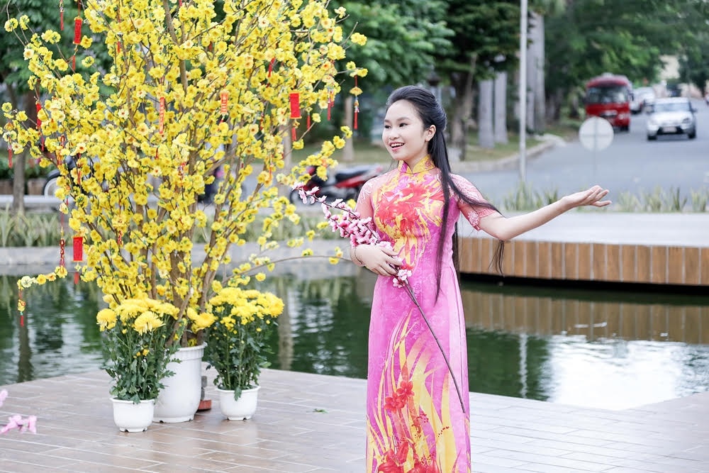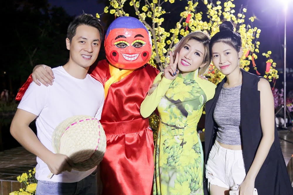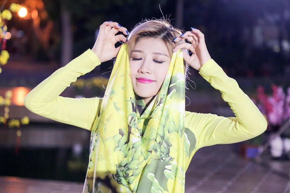 Không khí rộn ràng, những cành mai tươi thắm tạo cảm giác rộn ràng khi xuân đến. Tác giả Đừng yêu cho biết, khi thực hiện MV, cô rất háo hức mong chờ Tết. |