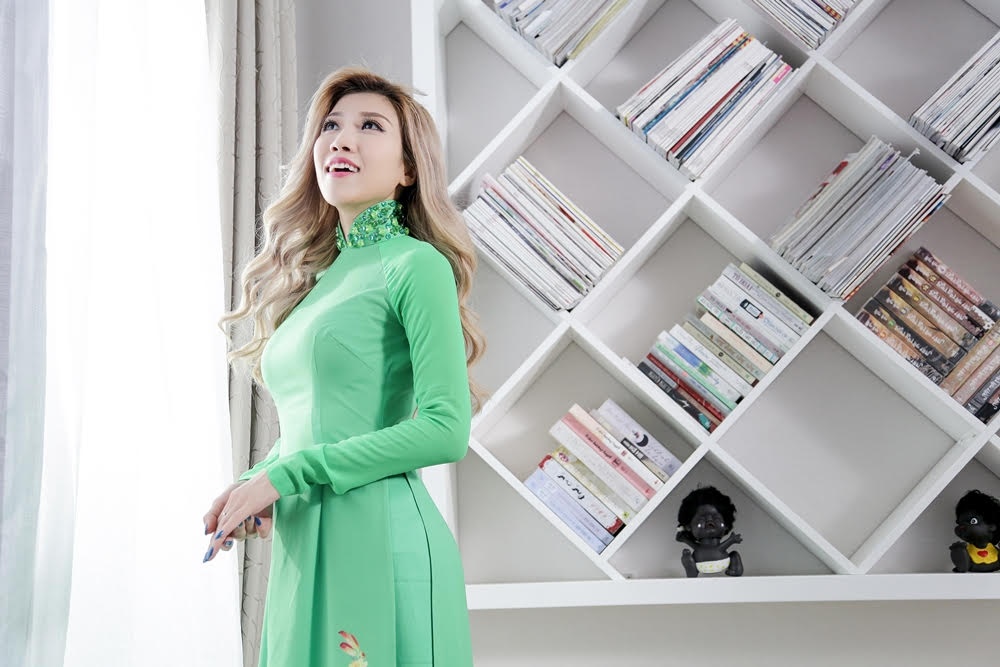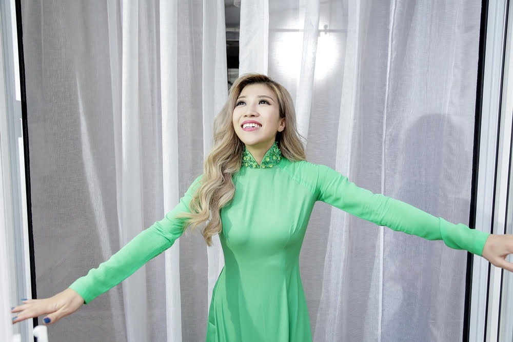 | Theo đuổi dòng nhạc trẻ, xây dựng hình ảnh khỏe khoắn, năng động nên cô luôn xuất hiện với trang phục hiện đại. Đây là lần đầu tiên ca sĩ gốc Hà thành mặc áo dài trong sản phẩm âm nhạc. |